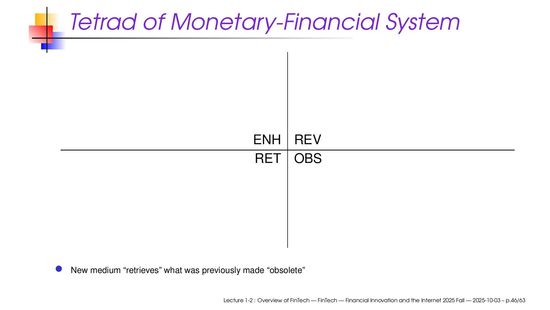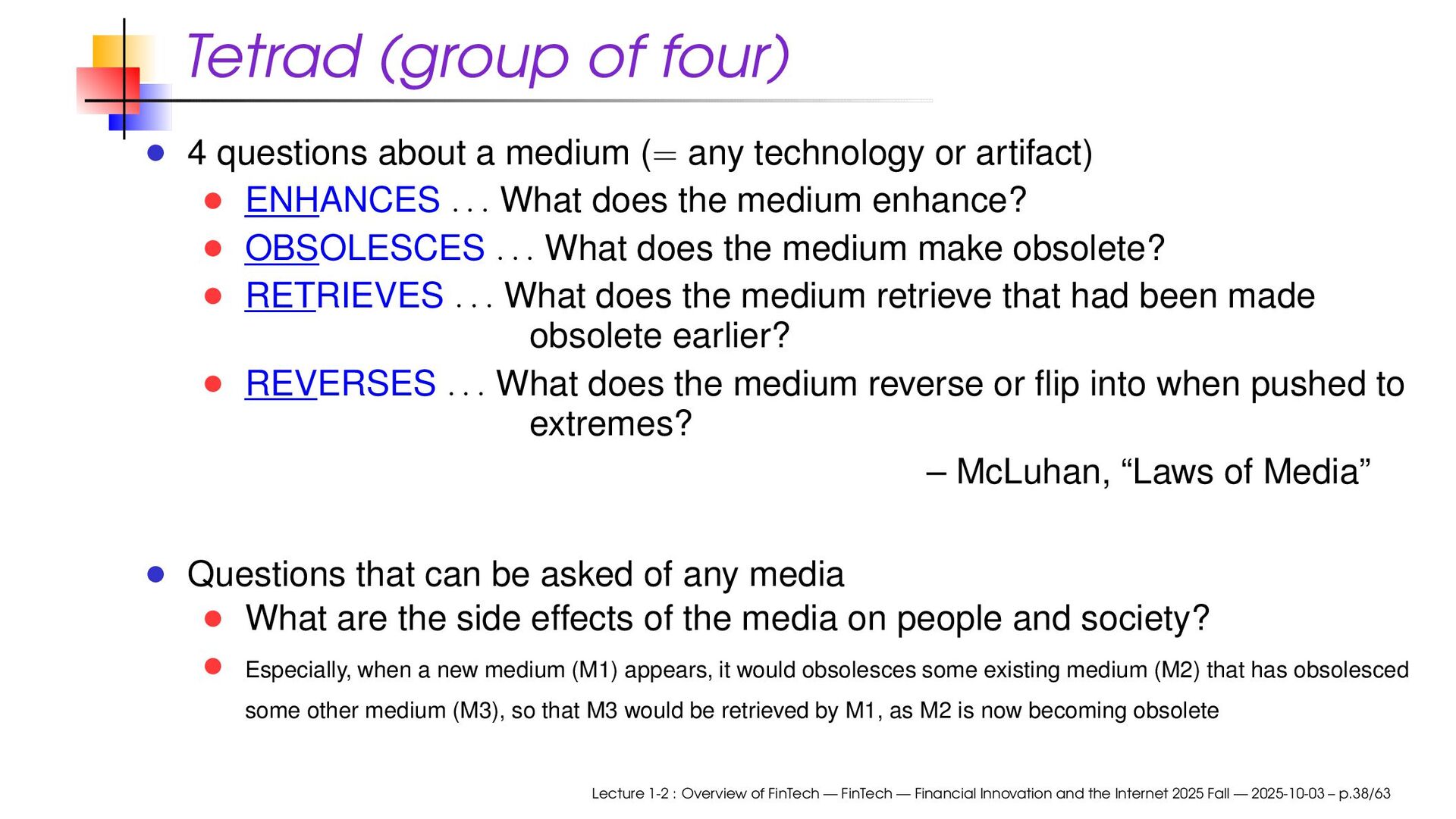 any technology or artifact) ENHANCES . . . What does the medium enhance? OBSOLESCES . . . What does the medium make obsolete? RETRIEVES . . . What does the medium retrieve that had been made obsolete earlier? REVERSES . . . What does the medium reverse or flip into when pushed to extremes? – McLuhan, “Laws of Media” Questions that can be asked of any media What are the side effects of the media on people and society? Especially, when a new medium (M1) appears, it would obsolesces some existing medium (M2) that has obsolesced some other medium (M3), so that M3 would be retrieved by M1, as M2 is now becoming obsolete Lecture 1-2 : Overview of FinTech — FinTech — Financial Innovation and the Internet 2025 Fall — 2025-10-03 – p.38/63