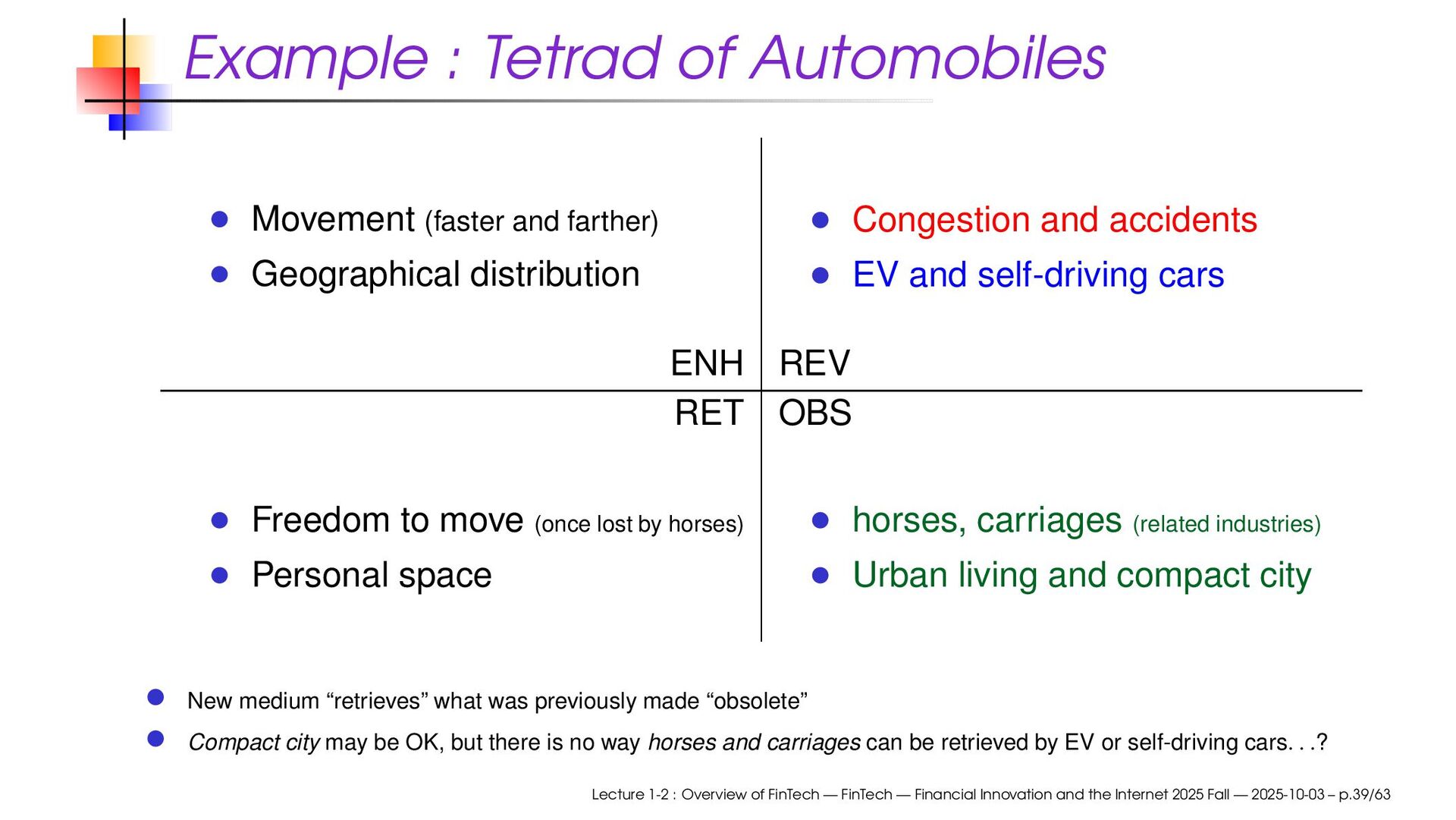 distribution Congestion and accidents EV and self-driving cars ENH REV RET OBS Freedom to move (once lost by horses) Personal space horses, carriages (related industries) Urban living and compact city New medium “retrieves” what was previously made “obsolete” Compact city may be OK, but there is no way horses and carriages can be retrieved by EV or self-driving cars. . .? Lecture 1-2 : Overview of FinTech — FinTech — Financial Innovation and the Internet 2025 Fall — 2025-10-03 – p.39/63