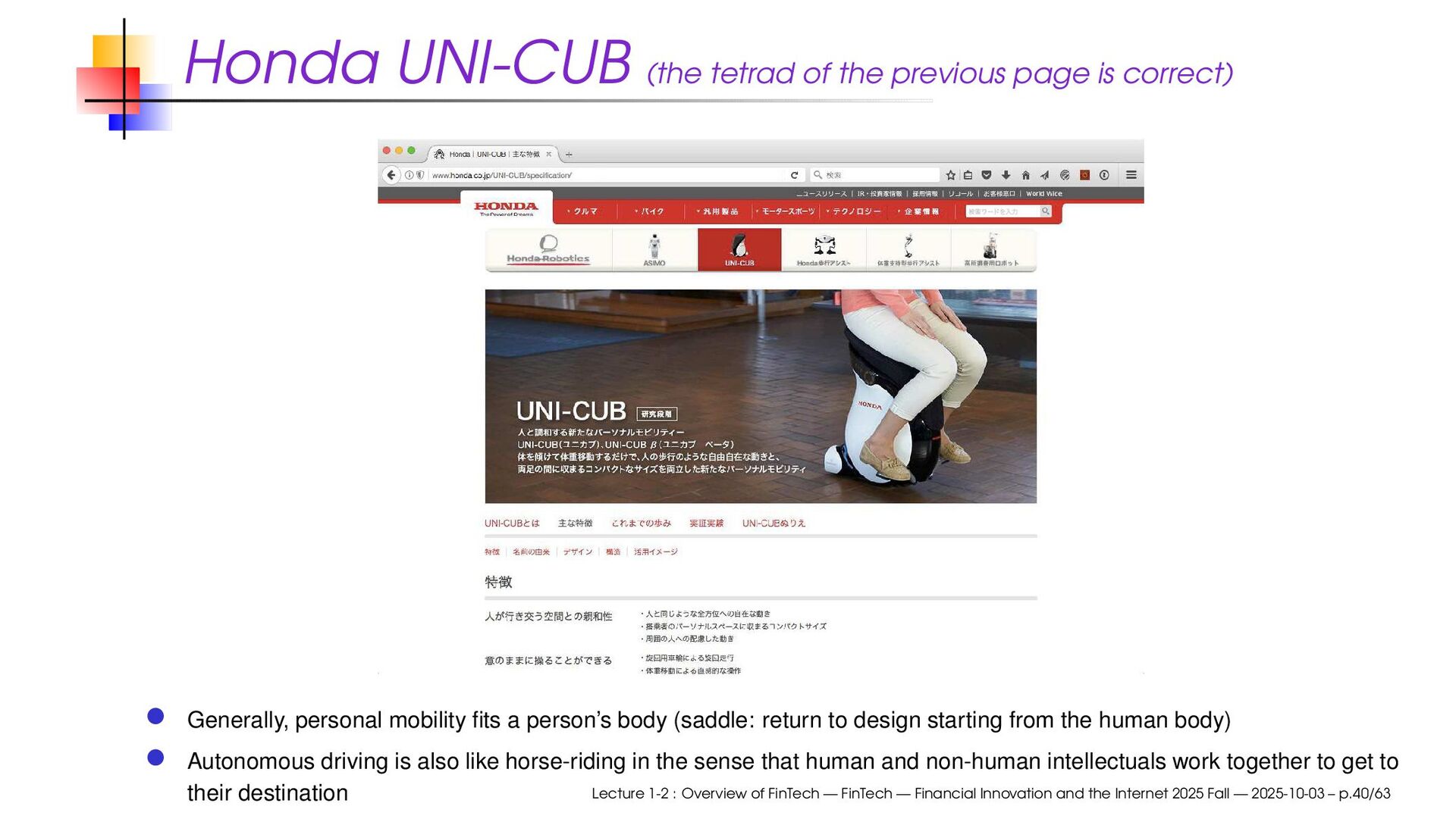 Generally, personal mobility fits a person’s body (saddle: return to design starting from the human body) Autonomous driving is also like horse-riding in the sense that human and non-human intellectuals work together to get to their destination Lecture 1-2 : Overview of FinTech — FinTech — Financial Innovation and the Internet 2025 Fall — 2025-10-03 – p.40/63