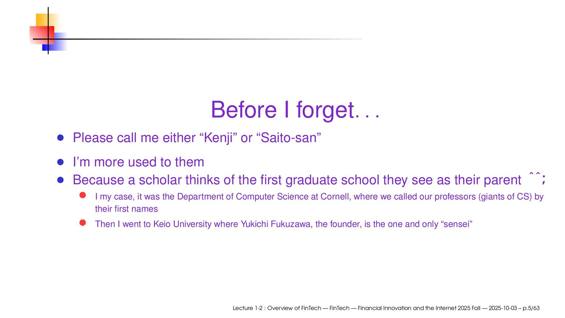 “Kenji” or “Saito-san” I’m more used to them Because a scholar thinks of the first graduate school they see as their parent I my case, it was the Department of Computer Science at Cornell, where we called our professors (giants of CS) by their first names Then I went to Keio University where Yukichi Fukuzawa, the founder, is the one and only “sensei” Lecture 1-2 : Overview of FinTech — FinTech — Financial Innovation and the Internet 2025 Fall — 2025-10-03 – p.5/63