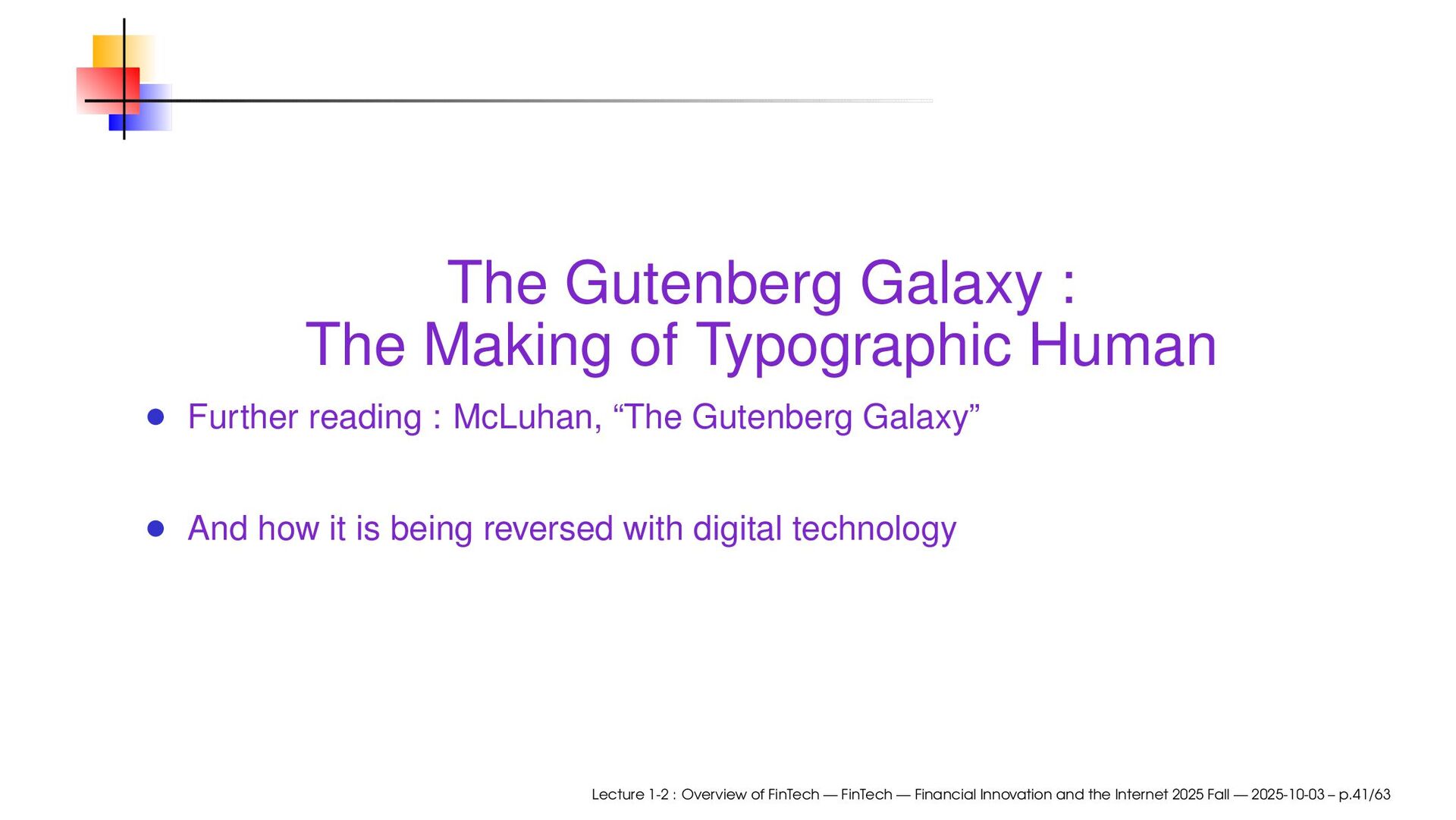 reading : McLuhan, “The Gutenberg Galaxy” And how it is being reversed with digital technology Lecture 1-2 : Overview of FinTech — FinTech — Financial Innovation and the Internet 2025 Fall — 2025-10-03 – p.41/63
