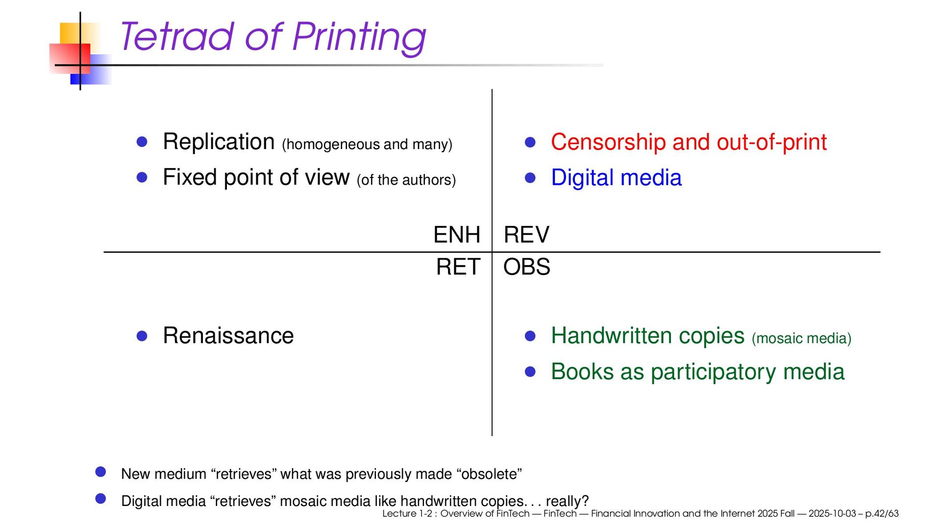 view (of the authors) Censorship and out-of-print Digital media ENH REV RET OBS Renaissance Handwritten copies (mosaic media) Books as participatory media New medium “retrieves” what was previously made “obsolete” Digital media “retrieves” mosaic media like handwritten copies. . . really? Lecture 1-2 : Overview of FinTech — FinTech — Financial Innovation and the Internet 2025 Fall — 2025-10-03 – p.42/63