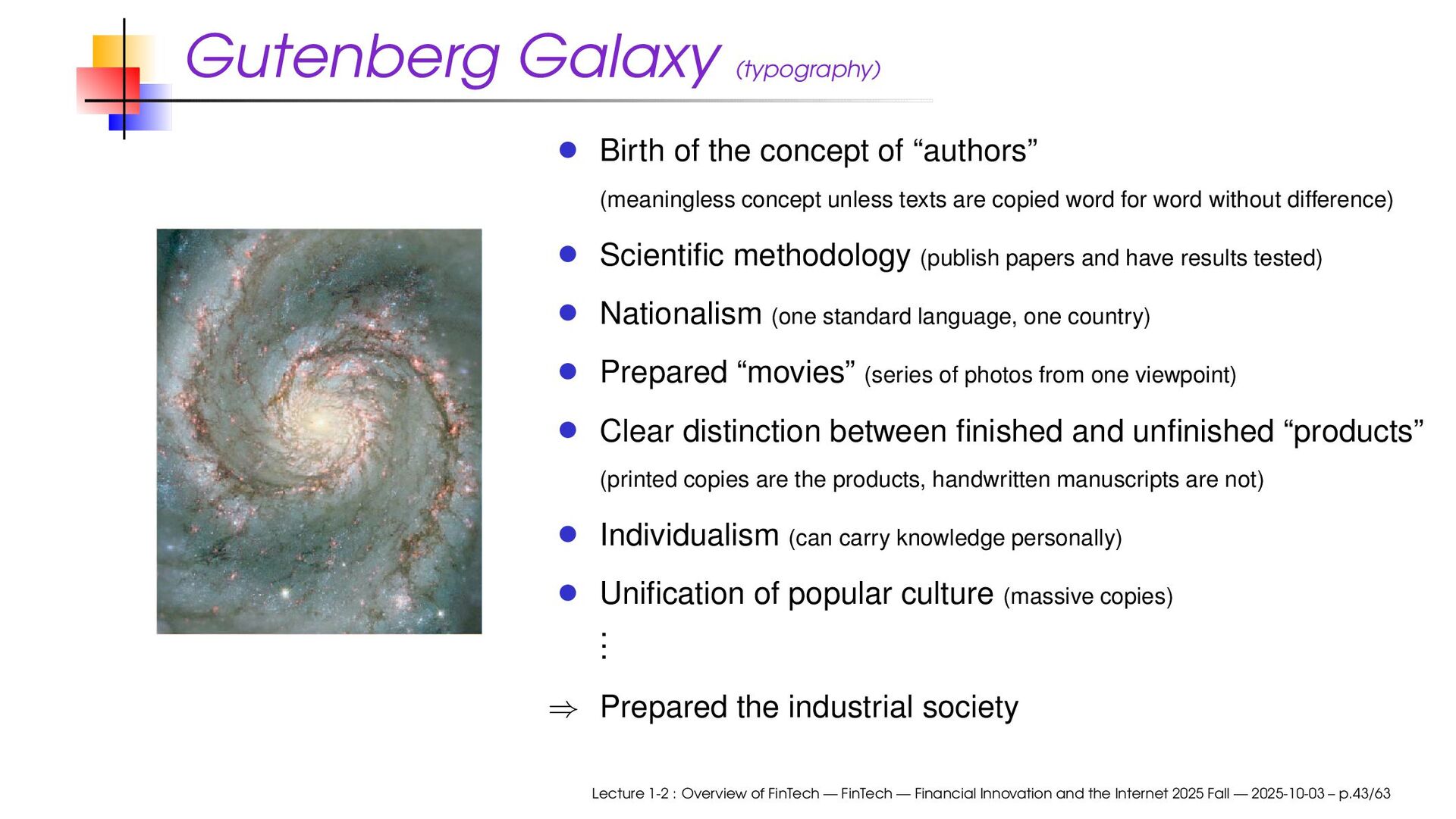 concept unless texts are copied word for word without difference) Scientific methodology (publish papers and have results tested) Nationalism (one standard language, one country) Prepared “movies” (series of photos from one viewpoint) Clear distinction between finished and unfinished “products” (printed copies are the products, handwritten manuscripts are not) Individualism (can carry knowledge personally) Unification of popular culture (massive copies) . . . ⇒ Prepared the industrial society Lecture 1-2 : Overview of FinTech — FinTech — Financial Innovation and the Internet 2025 Fall — 2025-10-03 – p.43/63