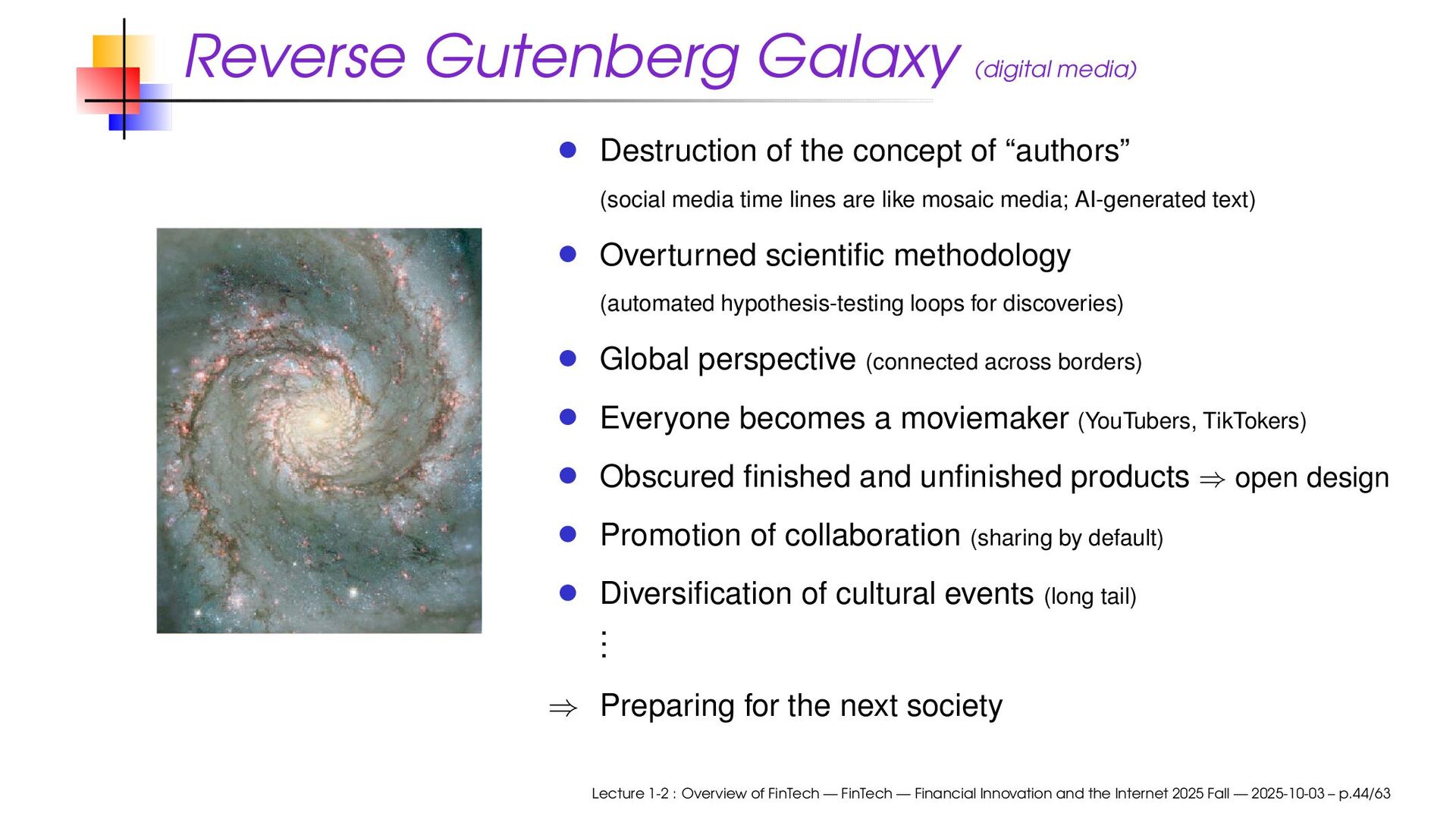 “authors” (social media time lines are like mosaic media; AI-generated text) Overturned scientific methodology (automated hypothesis-testing loops for discoveries) Global perspective (connected across borders) Everyone becomes a moviemaker (YouTubers, TikTokers) Obscured finished and unfinished products ⇒ open design Promotion of collaboration (sharing by default) Diversification of cultural events (long tail) . . . ⇒ Preparing for the next society Lecture 1-2 : Overview of FinTech — FinTech — Financial Innovation and the Internet 2025 Fall — 2025-10-03 – p.44/63