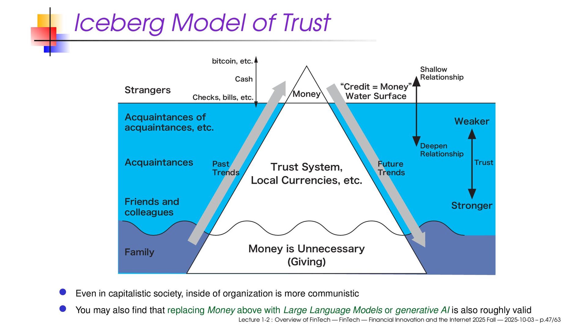 4USBOHFST %FFQFO 3FMBUJPOTIJQ 4IBMMPX 3FMBUJPOTIJQ $IFDLT CJMMT FUD $BTI CJUDPJO FUD "DRVBJOUBODFTPG BDRVBJOUBODFT FUD "DRVBJOUBODFT 'SJFOETBOE DPMMFBHVFT 'BNJMZ 5SVTU4ZTUFN -PDBM$VSSFODJFT FUD .POFZJT6OOFDFTTBSZ (JWJOH 1BTU 5SFOET 'VUVSF 5SFOET Even in capitalistic society, inside of organization is more communistic You may also find that replacing Money above with Large Language Models or generative AI is also roughly valid Lecture 1-2 : Overview of FinTech — FinTech — Financial Innovation and the Internet 2025 Fall — 2025-10-03 – p.47/63