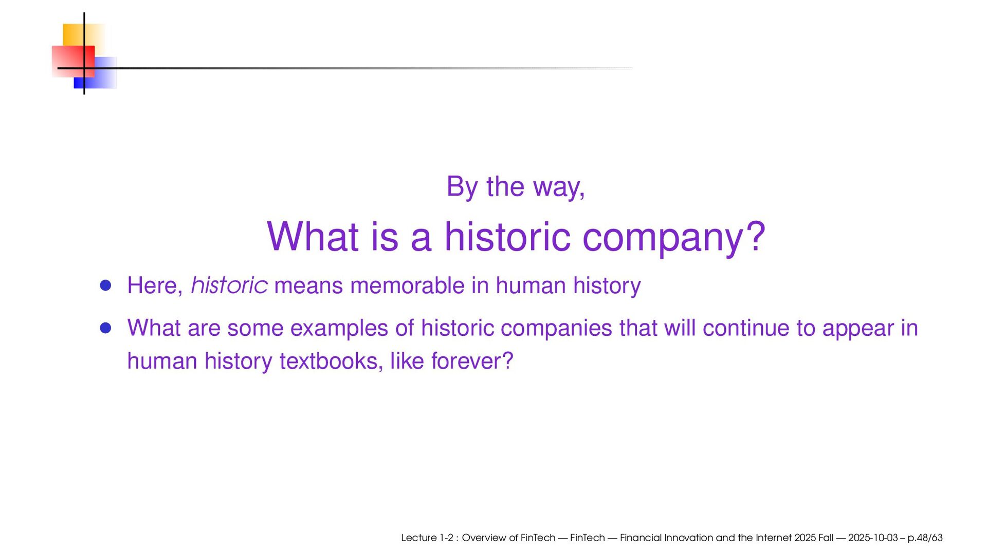 means memorable in human history What are some examples of historic companies that will continue to appear in human history textbooks, like forever? Lecture 1-2 : Overview of FinTech — FinTech — Financial Innovation and the Internet 2025 Fall — 2025-10-03 – p.48/63