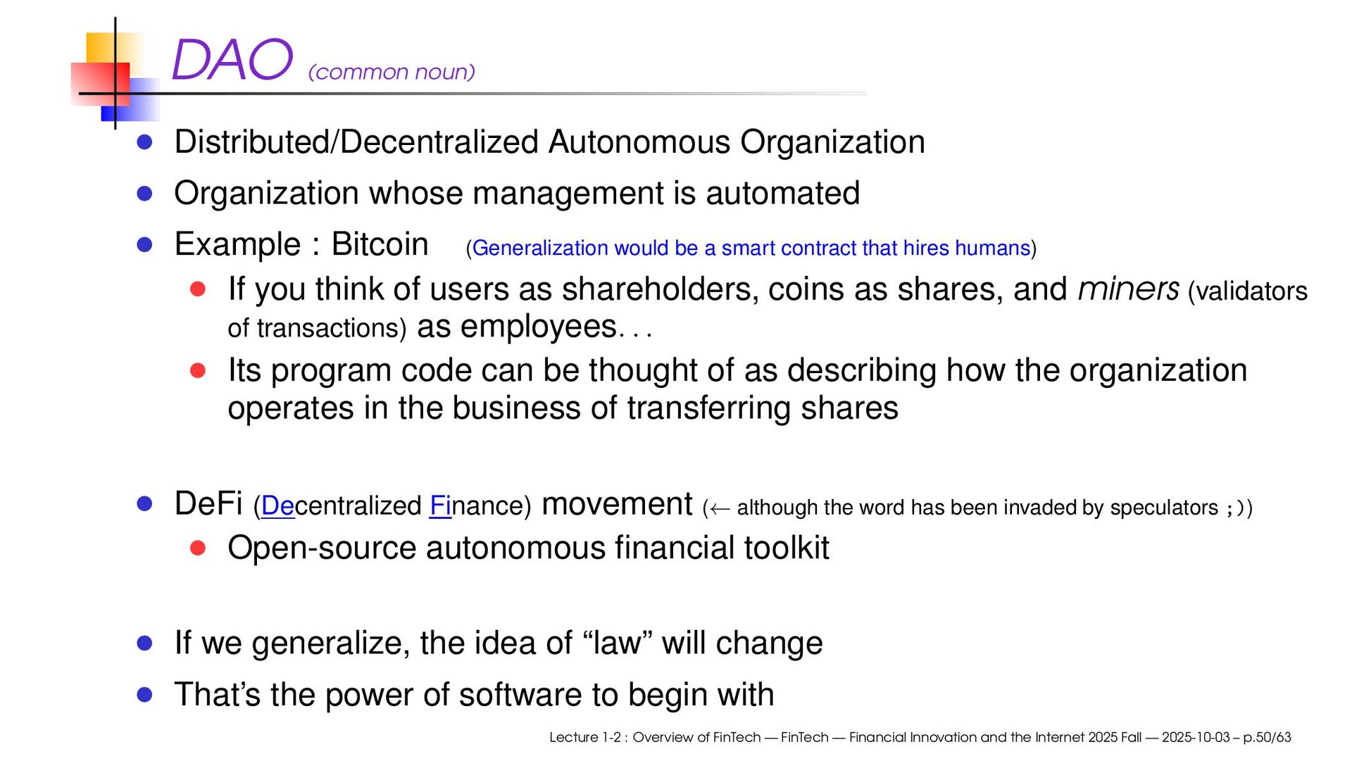 automated Example : Bitcoin (Generalization would be a smart contract that hires humans) If you think of users as shareholders, coins as shares, and miners (validators of transactions) as employees . . . Its program code can be thought of as describing how the organization operates in the business of transferring shares DeFi (Decentralized Finance) movement (← although the word has been invaded by speculators ;)) Open-source autonomous financial toolkit If we generalize, the idea of “law” will change That’s the power of software to begin with Lecture 1-2 : Overview of FinTech — FinTech — Financial Innovation and the Internet 2025 Fall — 2025-10-03 – p.50/63