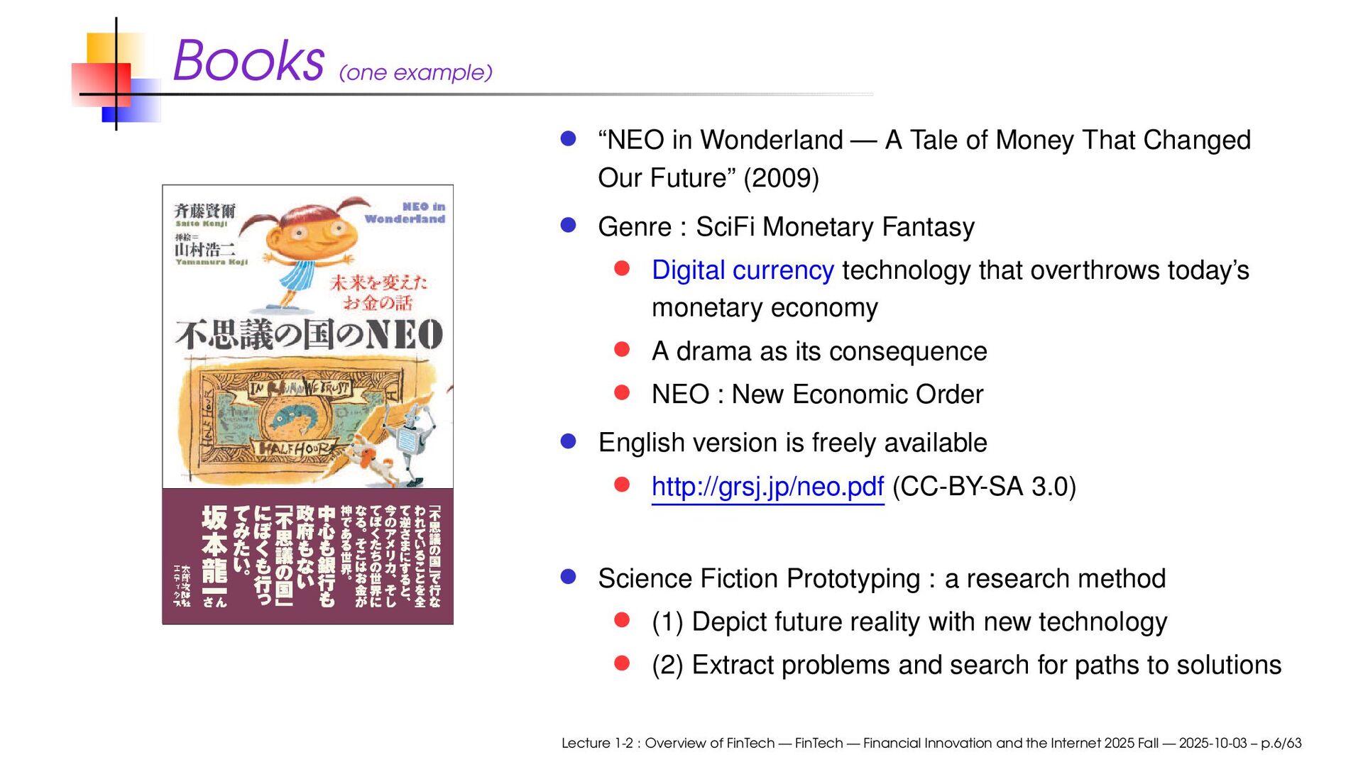 Money That Changed Our Future” (2009) Genre : SciFi Monetary Fantasy Digital currency technology that overthrows today’s monetary economy A drama as its consequence NEO : New Economic Order English version is freely available http://grsj.jp/neo.pdf (CC-BY-SA 3.0) Science Fiction Prototyping : a research method (1) Depict future reality with new technology (2) Extract problems and search for paths to solutions Lecture 1-2 : Overview of FinTech — FinTech — Financial Innovation and the Internet 2025 Fall — 2025-10-03 – p.6/63