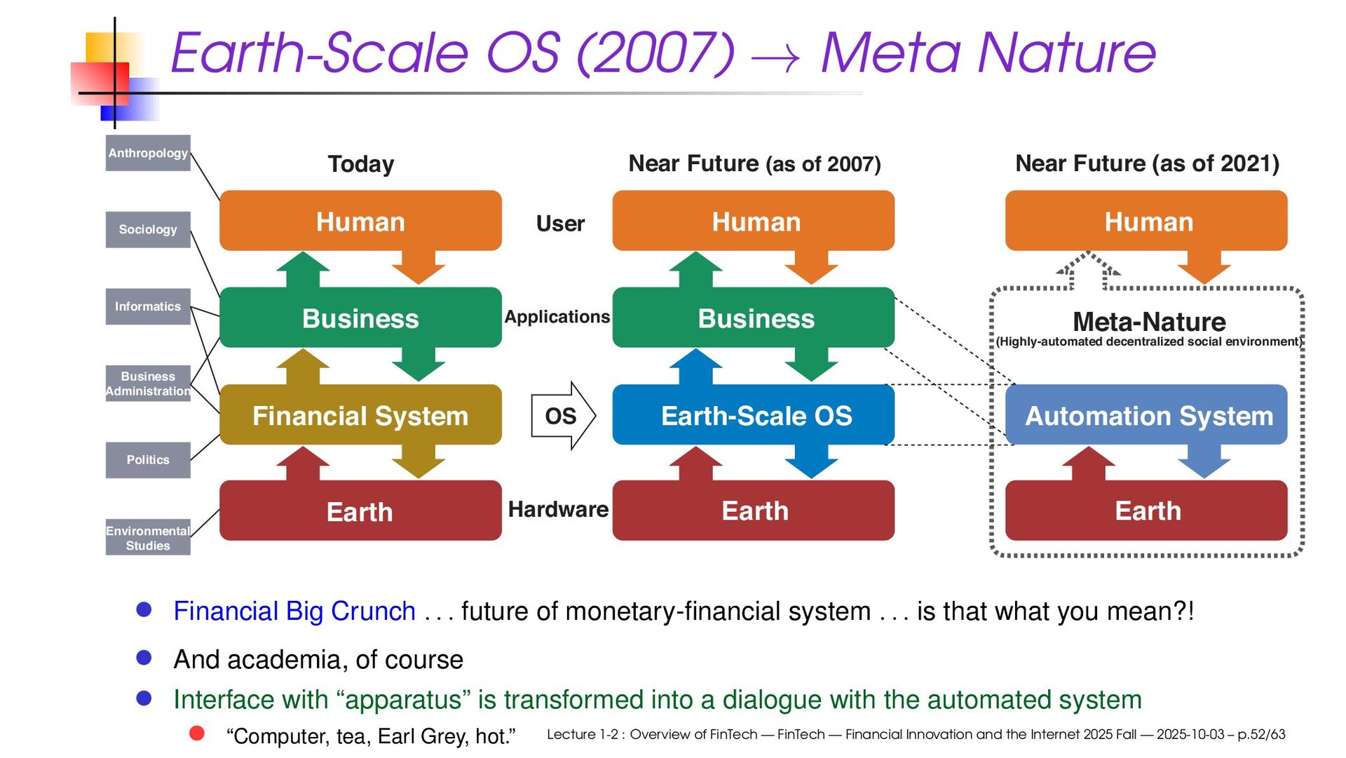 Sociology Business Administration Politics Today Hardware Applications User OS Human Business Financial System Human Business Earth-Scale OS Automation System Earth Earth Near Future (as of 2007) Human Meta-Nature (Highly-automated decentralized social environment) Earth Near Future (as of 2021) Financial Big Crunch . . . future of monetary-financial system . . . is that what you mean?! And academia, of course Interface with “apparatus” is transformed into a dialogue with the automated system “Computer, tea, Earl Grey, hot.” Lecture 1-2 : Overview of FinTech — FinTech — Financial Innovation and the Internet 2025 Fall — 2025-10-03 – p.52/63