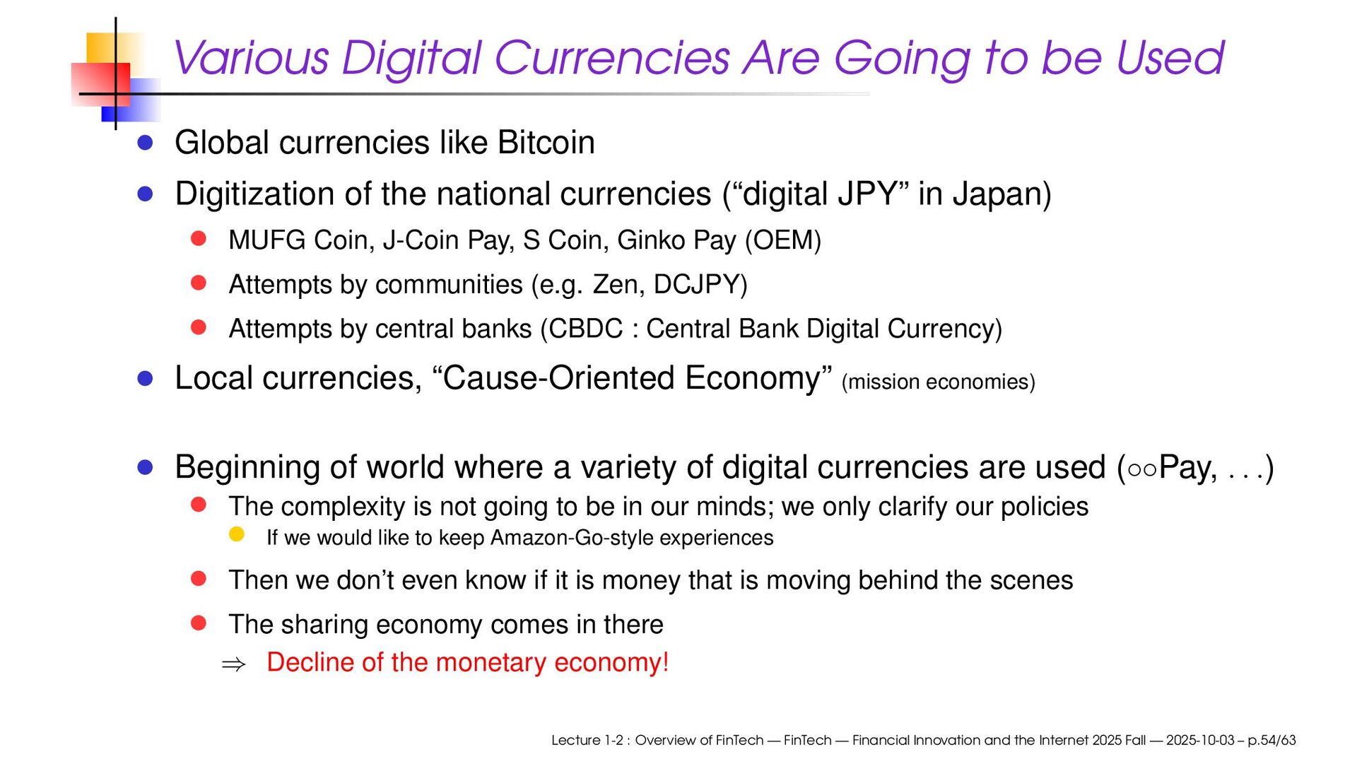 like Bitcoin Digitization of the national currencies (“digital JPY” in Japan) MUFG Coin, J-Coin Pay, S Coin, Ginko Pay (OEM) Attempts by communities (e.g. Zen, DCJPY) Attempts by central banks (CBDC : Central Bank Digital Currency) Local currencies, “Cause-Oriented Economy” (mission economies) Beginning of world where a variety of digital currencies are used (◦◦Pay, . . . ) The complexity is not going to be in our minds; we only clarify our policies If we would like to keep Amazon-Go-style experiences Then we don’t even know if it is money that is moving behind the scenes The sharing economy comes in there ⇒ Decline of the monetary economy! Lecture 1-2 : Overview of FinTech — FinTech — Financial Innovation and the Internet 2025 Fall — 2025-10-03 – p.54/63