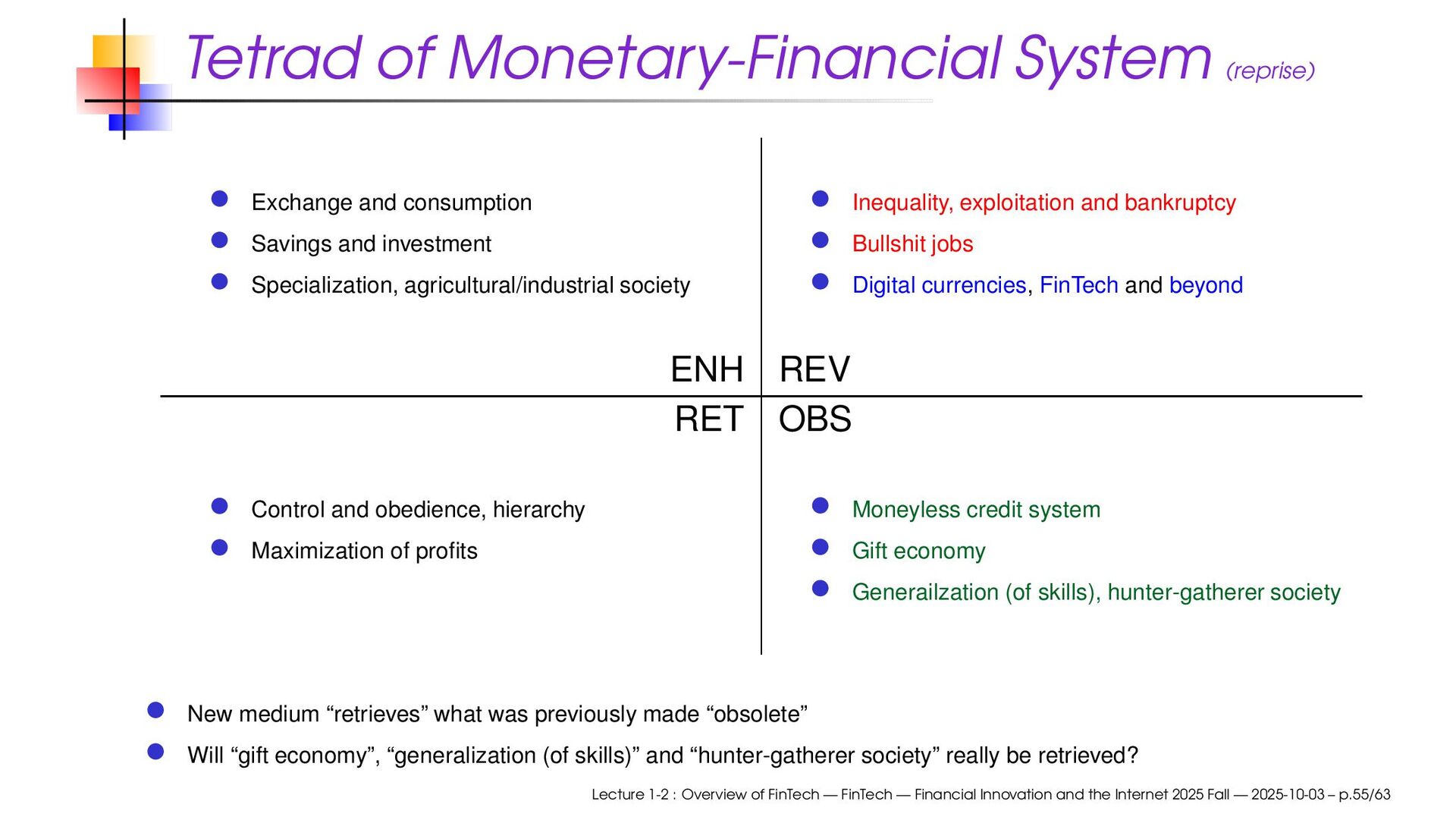 investment Specialization, agricultural/industrial society Inequality, exploitation and bankruptcy Bullshit jobs Digital currencies, FinTech and beyond ENH REV RET OBS Control and obedience, hierarchy Maximization of profits Moneyless credit system Gift economy Generailzation (of skills), hunter-gatherer society New medium “retrieves” what was previously made “obsolete” Will “gift economy”, “generalization (of skills)” and “hunter-gatherer society” really be retrieved? Lecture 1-2 : Overview of FinTech — FinTech — Financial Innovation and the Internet 2025 Fall — 2025-10-03 – p.55/63