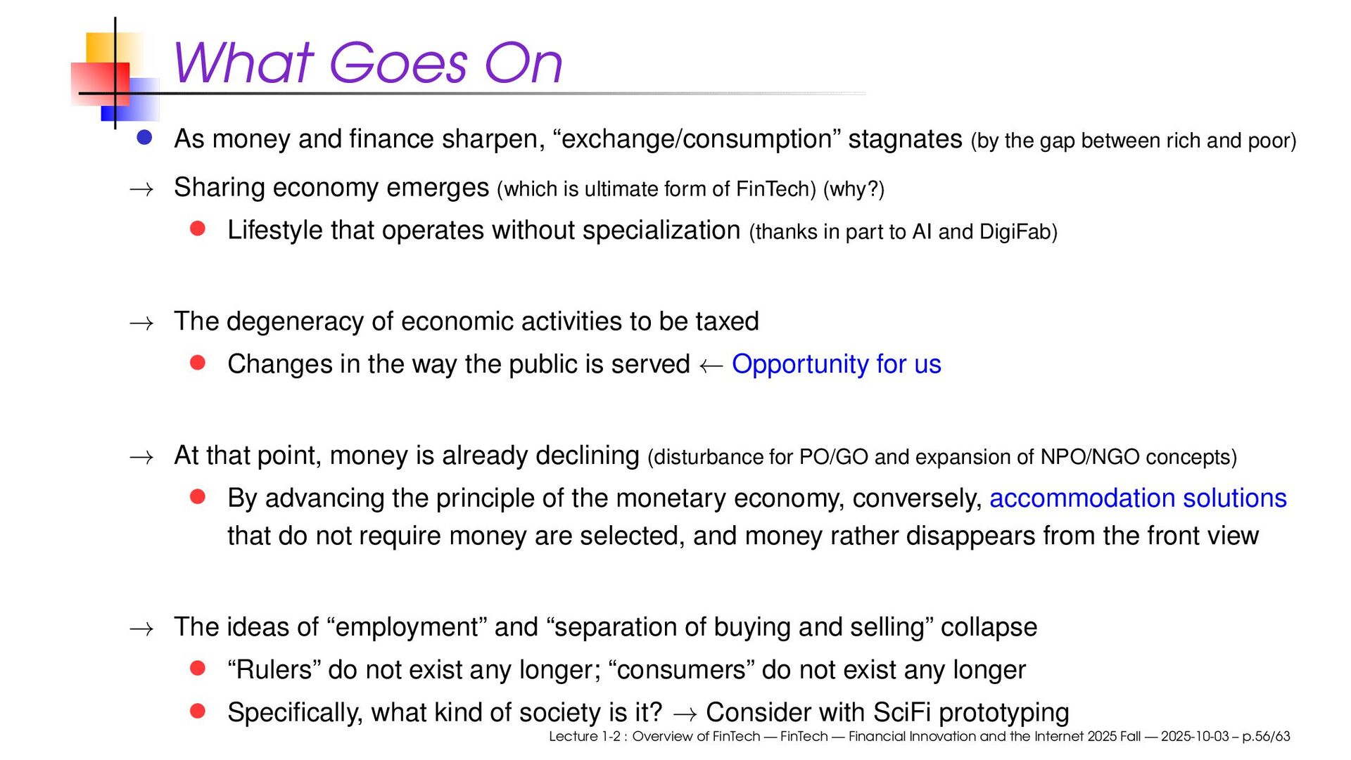 (by the gap between rich and poor) → Sharing economy emerges (which is ultimate form of FinTech) (why?) Lifestyle that operates without specialization (thanks in part to AI and DigiFab) → The degeneracy of economic activities to be taxed Changes in the way the public is served ← Opportunity for us → At that point, money is already declining (disturbance for PO/GO and expansion of NPO/NGO concepts) By advancing the principle of the monetary economy, conversely, accommodation solutions that do not require money are selected, and money rather disappears from the front view → The ideas of “employment” and “separation of buying and selling” collapse “Rulers” do not exist any longer; “consumers” do not exist any longer Specifically, what kind of society is it? → Consider with SciFi prototyping Lecture 1-2 : Overview of FinTech — FinTech — Financial Innovation and the Internet 2025 Fall — 2025-10-03 – p.56/63