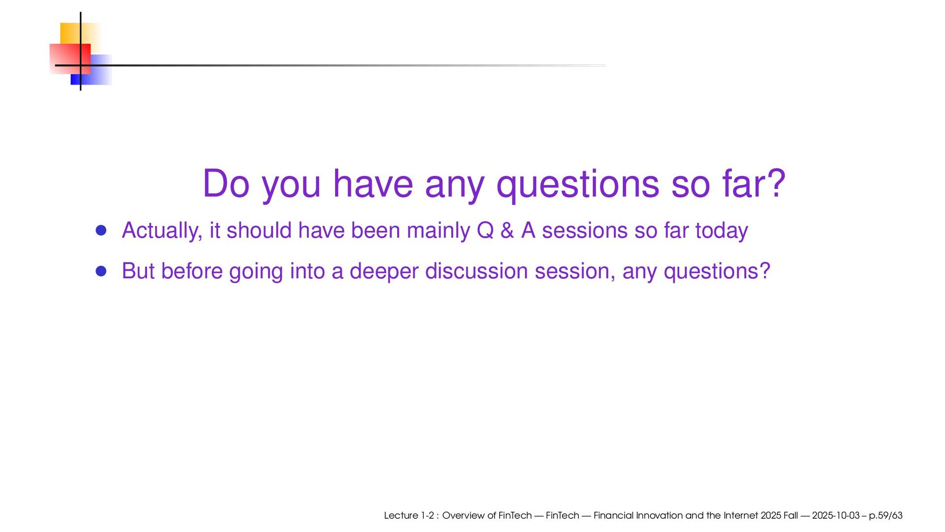 have been mainly Q & A sessions so far today But before going into a deeper discussion session, any questions? Lecture 1-2 : Overview of FinTech — FinTech — Financial Innovation and the Internet 2025 Fall — 2025-10-03 – p.59/63