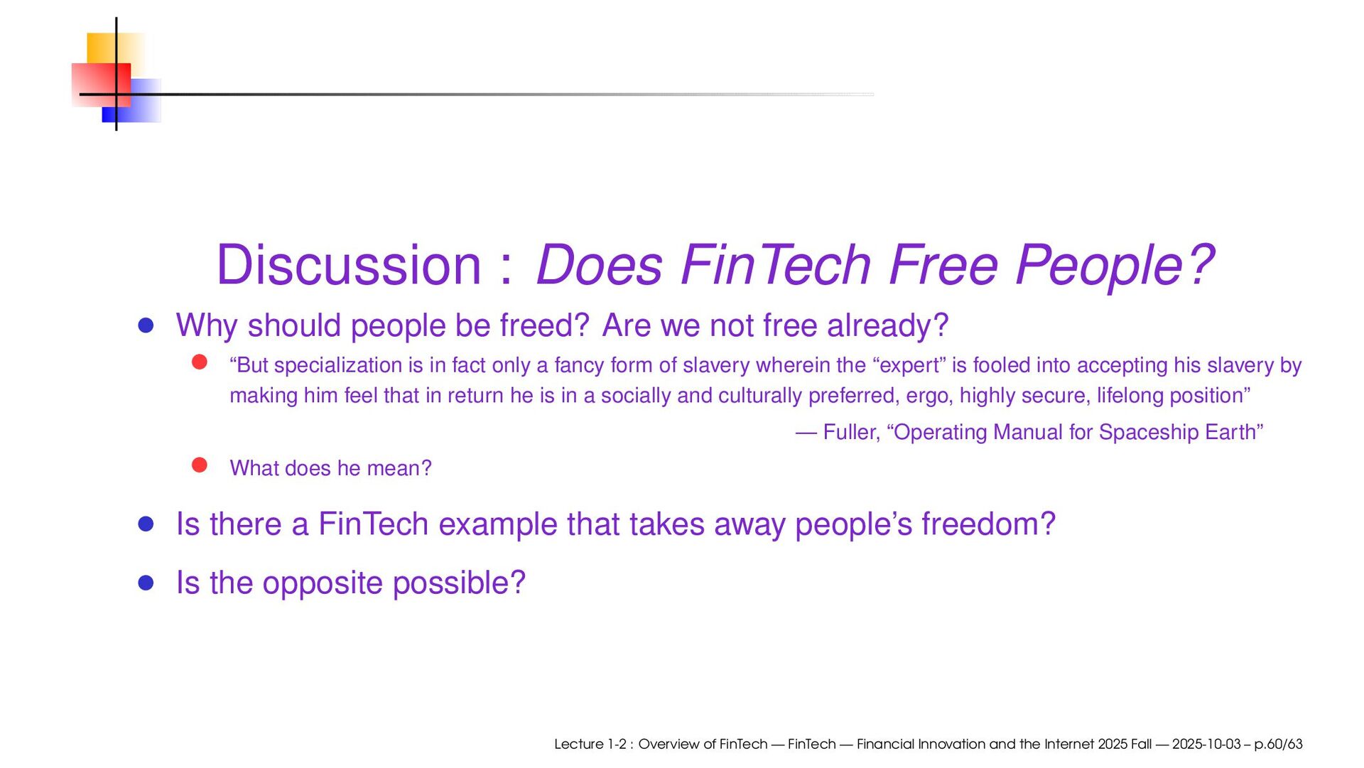 freed? Are we not free already? “But specialization is in fact only a fancy form of slavery wherein the “expert” is fooled into accepting his slavery by making him feel that in return he is in a socially and culturally preferred, ergo, highly secure, lifelong position” — Fuller, “Operating Manual for Spaceship Earth” What does he mean? Is there a FinTech example that takes away people’s freedom? Is the opposite possible? Lecture 1-2 : Overview of FinTech — FinTech — Financial Innovation and the Internet 2025 Fall — 2025-10-03 – p.60/63