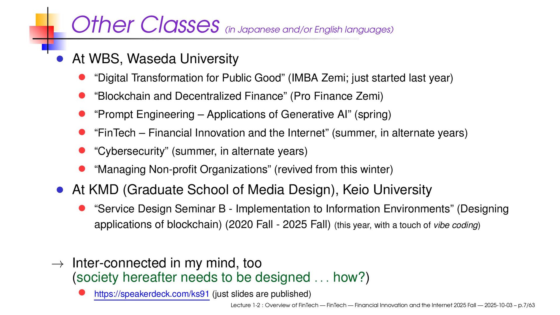 University “Digital Transformation for Public Good” (IMBA Zemi; just started last year) “Blockchain and Decentralized Finance” (Pro Finance Zemi) “Prompt Engineering – Applications of Generative AI” (spring) “FinTech – Financial Innovation and the Internet” (summer, in alternate years) “Cybersecurity” (summer, in alternate years) “Managing Non-profit Organizations” (revived from this winter) At KMD (Graduate School of Media Design), Keio University “Service Design Seminar B - Implementation to Information Environments” (Designing applications of blockchain) (2020 Fall - 2025 Fall) (this year, with a touch of vibe coding) → Inter-connected in my mind, too (society hereafter needs to be designed . . . how?) https://speakerdeck.com/ks91 (just slides are published) Lecture 1-2 : Overview of FinTech — FinTech — Financial Innovation and the Internet 2025 Fall — 2025-10-03 – p.7/63