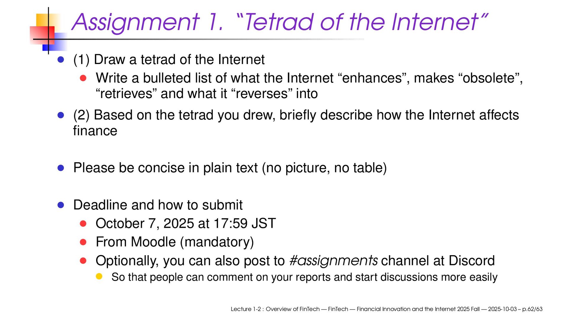of the Internet Write a bulleted list of what the Internet “enhances”, makes “obsolete”, “retrieves” and what it “reverses” into (2) Based on the tetrad you drew, briefly describe how the Internet affects finance Please be concise in plain text (no picture, no table) Deadline and how to submit October 7, 2025 at 17:59 JST From Moodle (mandatory) Optionally, you can also post to #assignments channel at Discord So that people can comment on your reports and start discussions more easily Lecture 1-2 : Overview of FinTech — FinTech — Financial Innovation and the Internet 2025 Fall — 2025-10-03 – p.62/63