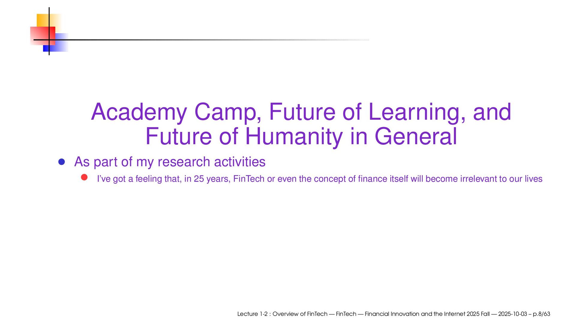 General As part of my research activities I’ve got a feeling that, in 25 years, FinTech or even the concept of finance itself will become irrelevant to our lives Lecture 1-2 : Overview of FinTech — FinTech — Financial Innovation and the Internet 2025 Fall — 2025-10-03 – p.8/63