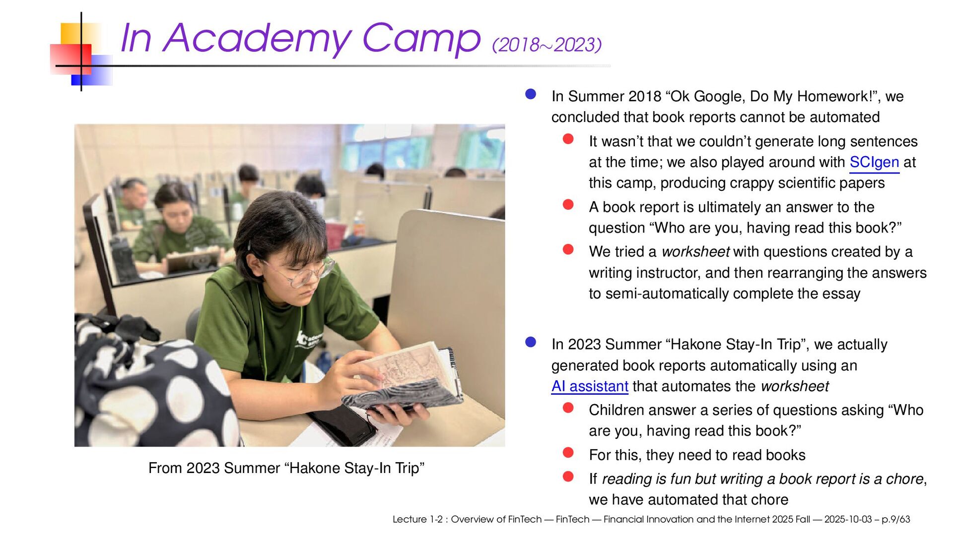 In Summer 2018 “Ok Google, Do My Homework!”, we concluded that book reports cannot be automated It wasn’t that we couldn’t generate long sentences at the time; we also played around with SCIgen at this camp, producing crappy scientific papers A book report is ultimately an answer to the question “Who are you, having read this book?” We tried a worksheet with questions created by a writing instructor, and then rearranging the answers to semi-automatically complete the essay In 2023 Summer “Hakone Stay-In Trip”, we actually generated book reports automatically using an AI assistant that automates the worksheet Children answer a series of questions asking “Who are you, having read this book?” For this, they need to read books If reading is fun but writing a book report is a chore, we have automated that chore Lecture 1-2 : Overview of FinTech — FinTech — Financial Innovation and the Internet 2025 Fall — 2025-10-03 – p.9/63