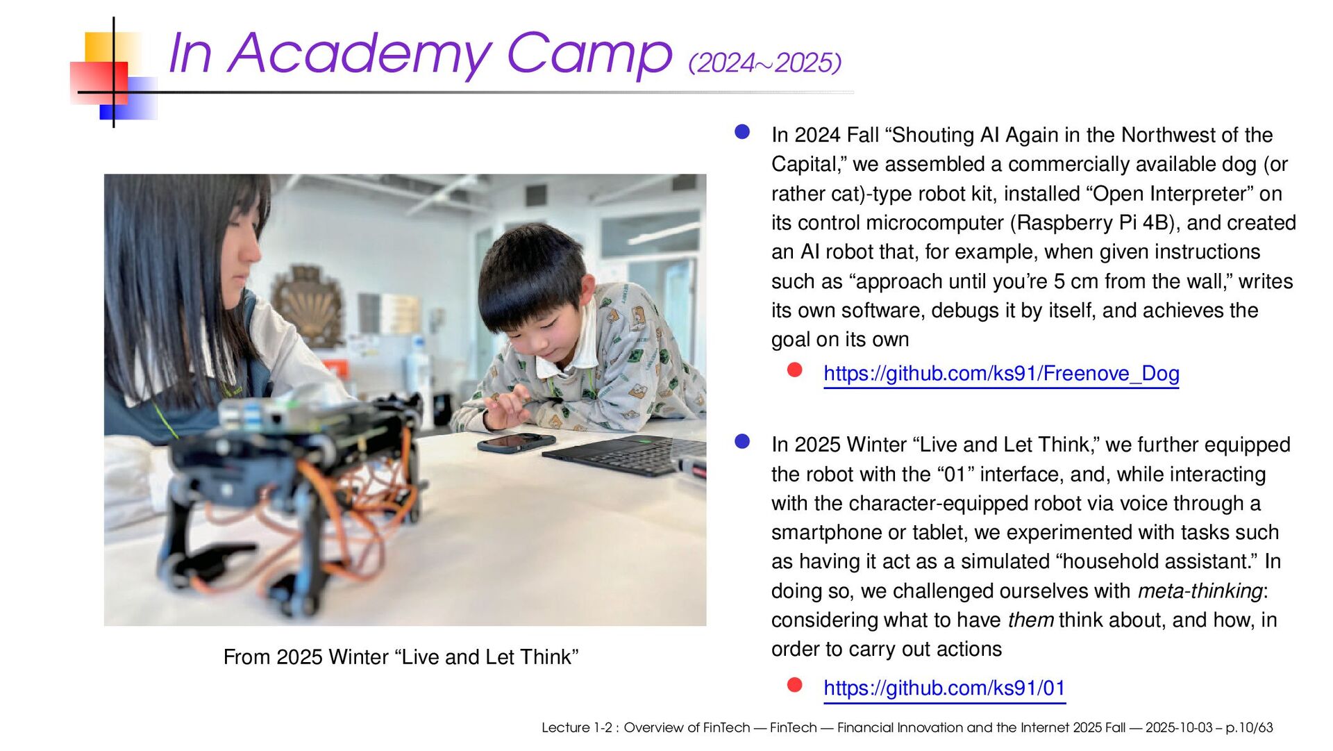 Think” In 2024 Fall “Shouting AI Again in the Northwest of the Capital,” we assembled a commercially available dog (or rather cat)-type robot kit, installed “Open Interpreter” on its control microcomputer (Raspberry Pi 4B), and created an AI robot that, for example, when given instructions such as “approach until you’re 5 cm from the wall,” writes its own software, debugs it by itself, and achieves the goal on its own https://github.com/ks91/Freenove_Dog In 2025 Winter “Live and Let Think,” we further equipped the robot with the “01” interface, and, while interacting with the character-equipped robot via voice through a smartphone or tablet, we experimented with tasks such as having it act as a simulated “household assistant.” In doing so, we challenged ourselves with meta-thinking: considering what to have them think about, and how, in order to carry out actions https://github.com/ks91/01 Lecture 1-2 : Overview of FinTech — FinTech — Financial Innovation and the Internet 2025 Fall — 2025-10-03 – p.10/63