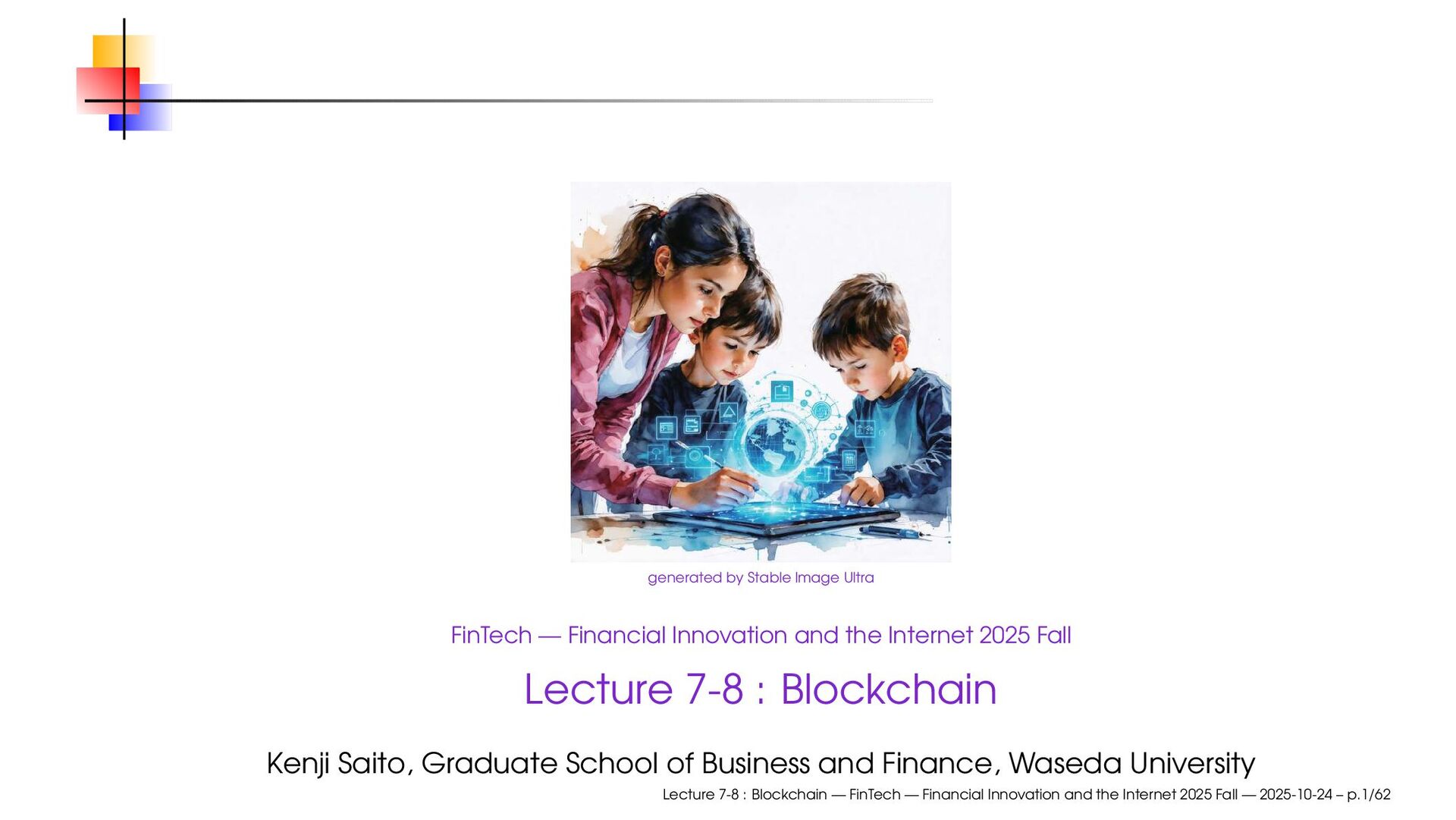 the Internet 2025 Fall Lecture 7-8 : Blockchain Kenji Saito, Graduate School of Business and Finance, Waseda University Lecture 7-8 : Blockchain — FinTech — Financial Innovation and the Internet 2025 Fall — 2025-10-24 – p.1/62