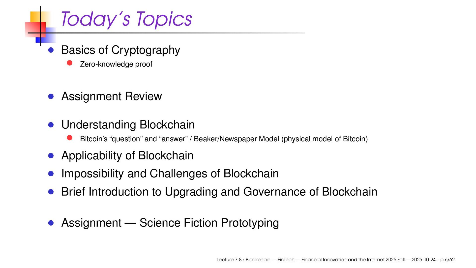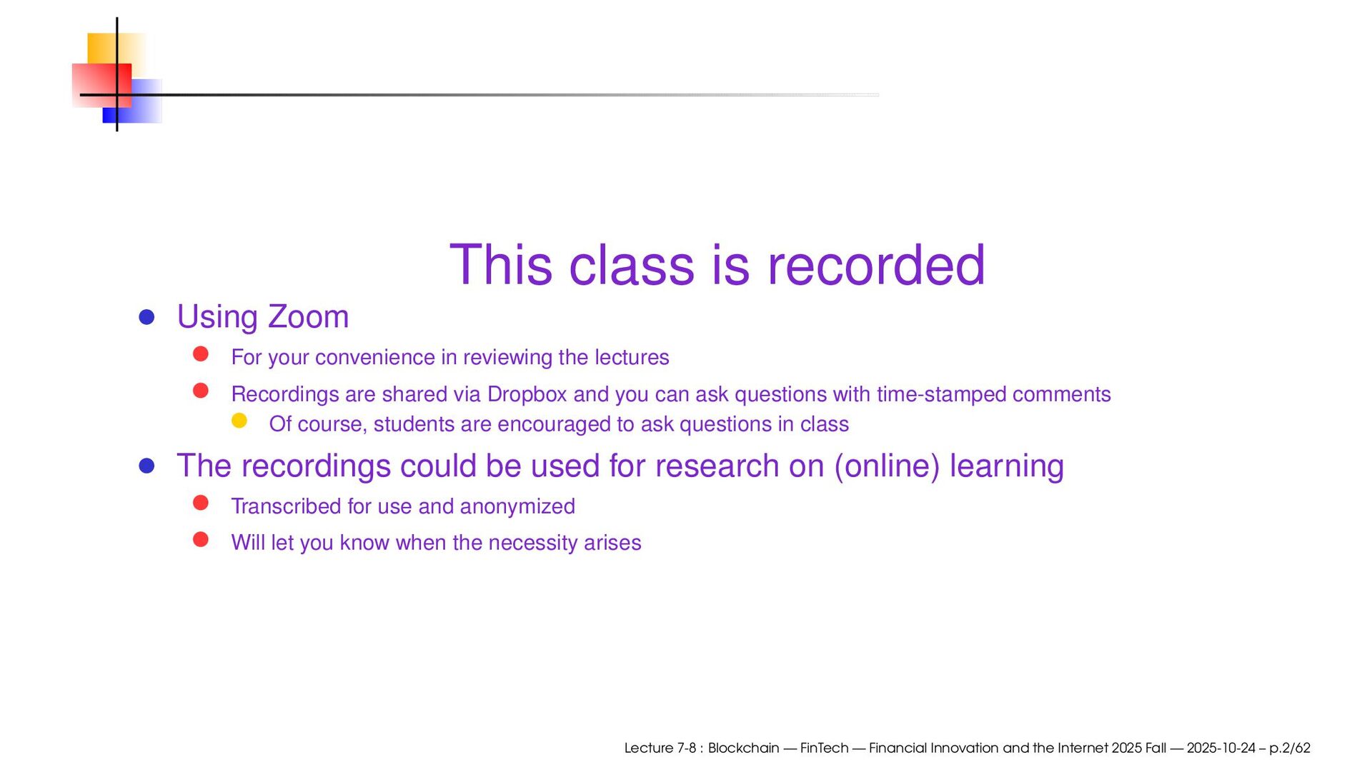 reviewing the lectures Recordings are shared via Dropbox and you can ask questions with time-stamped comments Of course, students are encouraged to ask questions in class The recordings could be used for research on (online) learning Transcribed for use and anonymized Will let you know when the necessity arises Lecture 7-8 : Blockchain — FinTech — Financial Innovation and the Internet 2025 Fall — 2025-10-24 – p.2/62