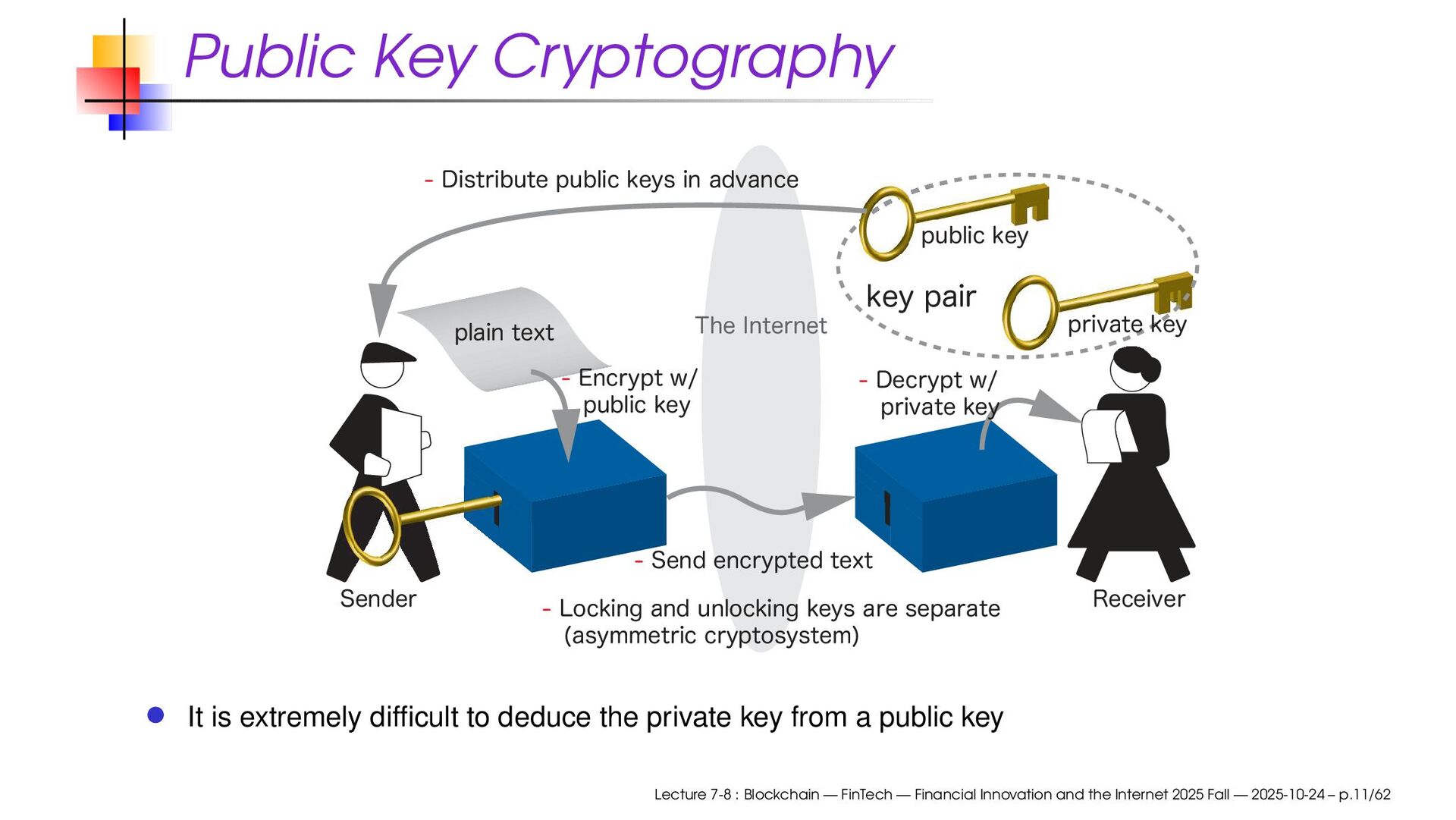 3FDFJWFS QMBJOUFYU QVCMJDLFZ QSJWBUFLFZ &ODSZQUX QVCMJDLFZ %FDSZQUX QSJWBUFLFZ 4FOEFODSZQUFEUFYU It is extremely difficult to deduce the private key from a public key Lecture 7-8 : Blockchain — FinTech — Financial Innovation and the Internet 2025 Fall — 2025-10-24 – p.11/62