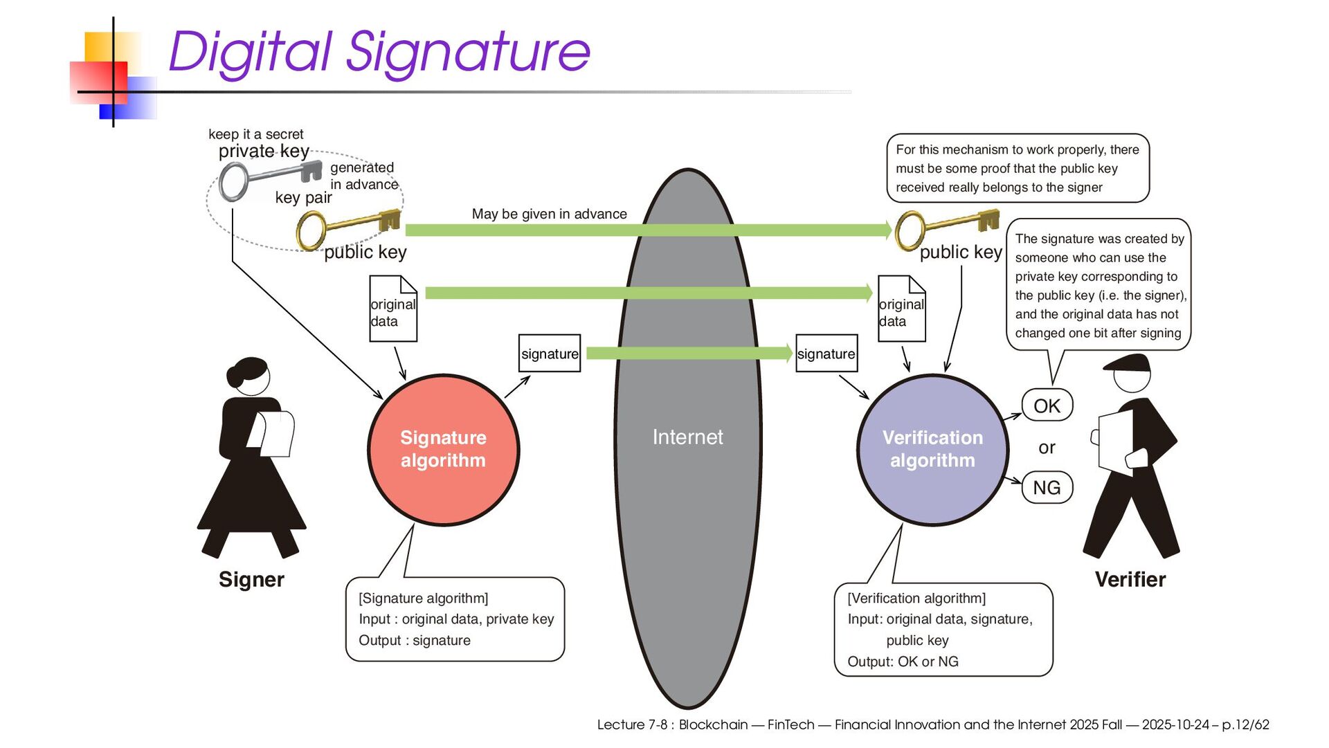 it a secret May be given in advance The signature was created by someone who can use the private key corresponding to the public key (i.e. the signer), and the original data has not changed one bit after signing For this mechanism to work properly, there must be some proof that the public key received really belongs to the signer [Signature algorithm] Input : original data, private key Output : signature [Verification algorithm] Input: original data, signature, public key Output: OK or NG Signer Signature algorithm Verification algorithm OK or NG Internet Verifier original data original data signature signature public key public key Lecture 7-8 : Blockchain — FinTech — Financial Innovation and the Internet 2025 Fall — 2025-10-24 – p.12/62