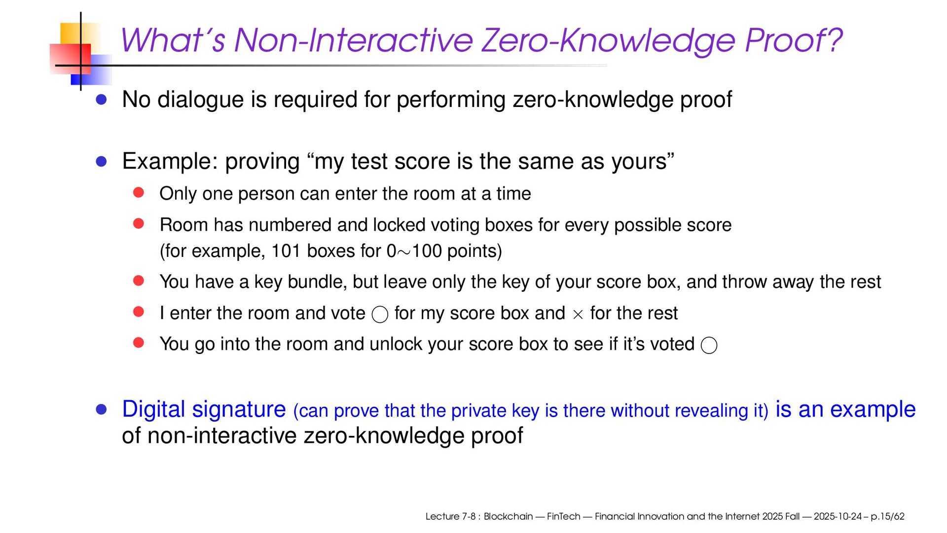 zero-knowledge proof Example: proving “my test score is the same as yours” Only one person can enter the room at a time Room has numbered and locked voting boxes for every possible score (for example, 101 boxes for 0∼100 points) You have a key bundle, but leave only the key of your score box, and throw away the rest I enter the room and vote for my score box and × for the rest You go into the room and unlock your score box to see if it’s voted Digital signature (can prove that the private key is there without revealing it) is an example of non-interactive zero-knowledge proof Lecture 7-8 : Blockchain — FinTech — Financial Innovation and the Internet 2025 Fall — 2025-10-24 – p.15/62