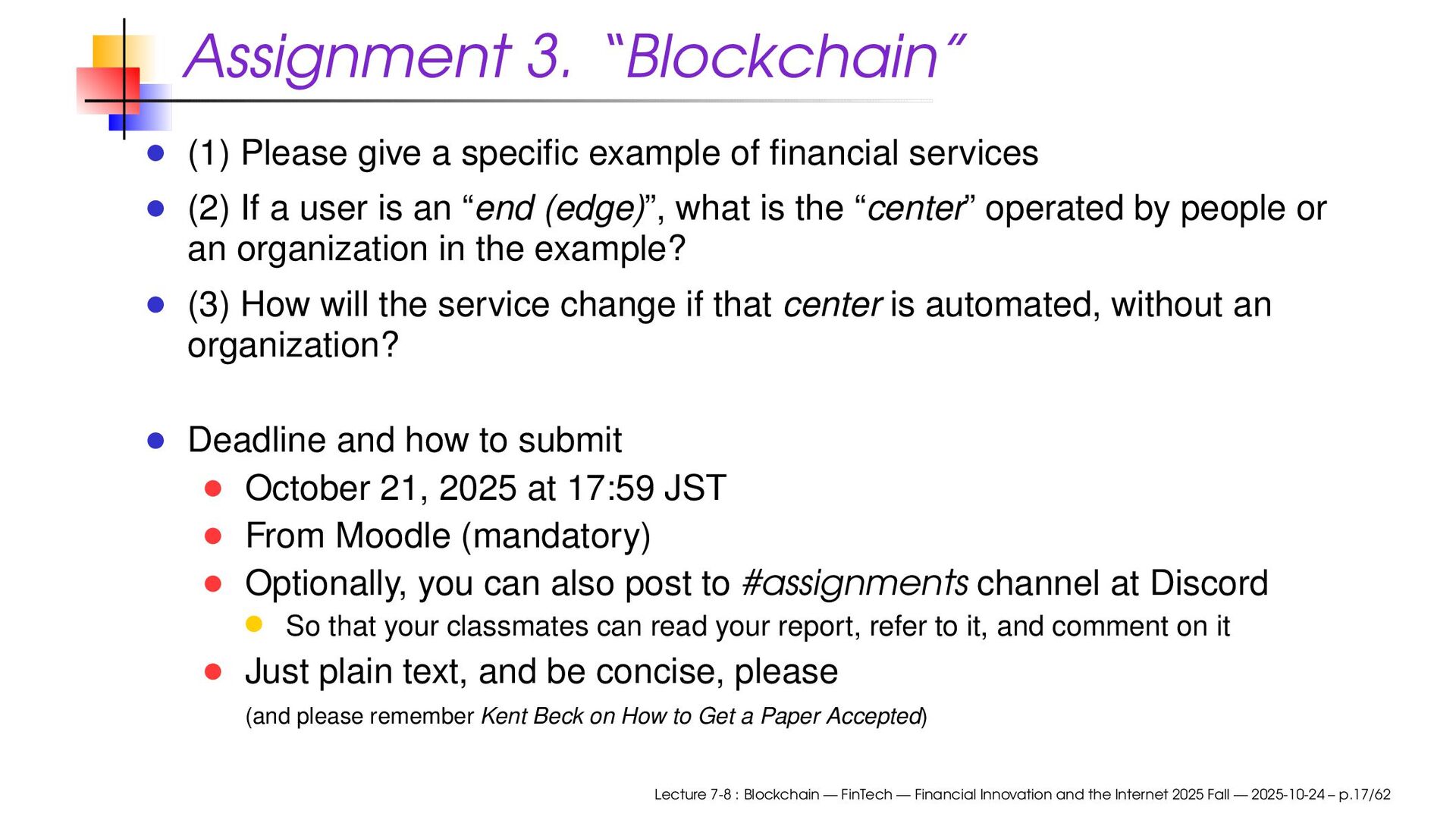 financial services (2) If a user is an “end (edge)”, what is the “center” operated by people or an organization in the example? (3) How will the service change if that center is automated, without an organization? Deadline and how to submit October 21, 2025 at 17:59 JST From Moodle (mandatory) Optionally, you can also post to #assignments channel at Discord So that your classmates can read your report, refer to it, and comment on it Just plain text, and be concise, please (and please remember Kent Beck on How to Get a Paper Accepted) Lecture 7-8 : Blockchain — FinTech — Financial Innovation and the Internet 2025 Fall — 2025-10-24 – p.17/62