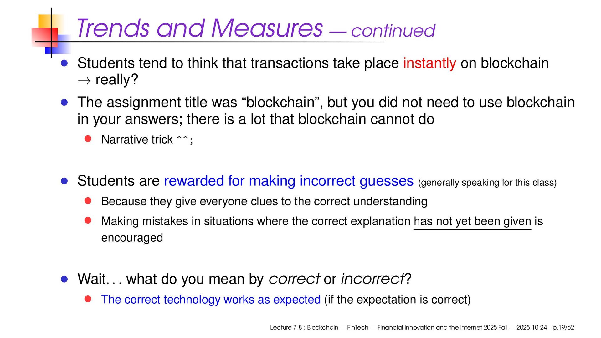 transactions take place instantly on blockchain → really? The assignment title was “blockchain”, but you did not need to use blockchain in your answers; there is a lot that blockchain cannot do Narrative trick ^^; Students are rewarded for making incorrect guesses (generally speaking for this class) Because they give everyone clues to the correct understanding Making mistakes in situations where the correct explanation has not yet been given is encouraged Wait . . . what do you mean by correct or incorrect? The correct technology works as expected (if the expectation is correct) Lecture 7-8 : Blockchain — FinTech — Financial Innovation and the Internet 2025 Fall — 2025-10-24 – p.19/62