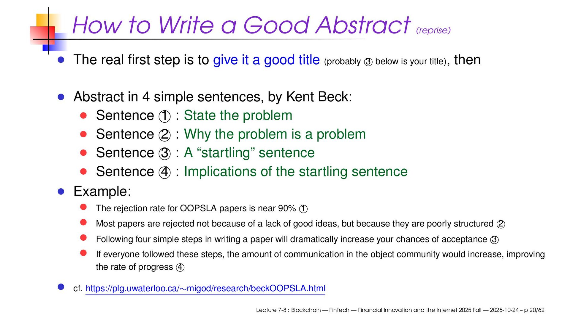 step is to give it a good title (probably 3 below is your title), then Abstract in 4 simple sentences, by Kent Beck: Sentence 1 : State the problem Sentence 2 : Why the problem is a problem Sentence 3 : A “startling” sentence Sentence 4 : Implications of the startling sentence Example: The rejection rate for OOPSLA papers is near 90% 1 Most papers are rejected not because of a lack of good ideas, but because they are poorly structured 2 Following four simple steps in writing a paper will dramatically increase your chances of acceptance 3 If everyone followed these steps, the amount of communication in the object community would increase, improving the rate of progress 4 cf. https://plg.uwaterloo.ca/∼migod/research/beckOOPSLA.html Lecture 7-8 : Blockchain — FinTech — Financial Innovation and the Internet 2025 Fall — 2025-10-24 – p.20/62