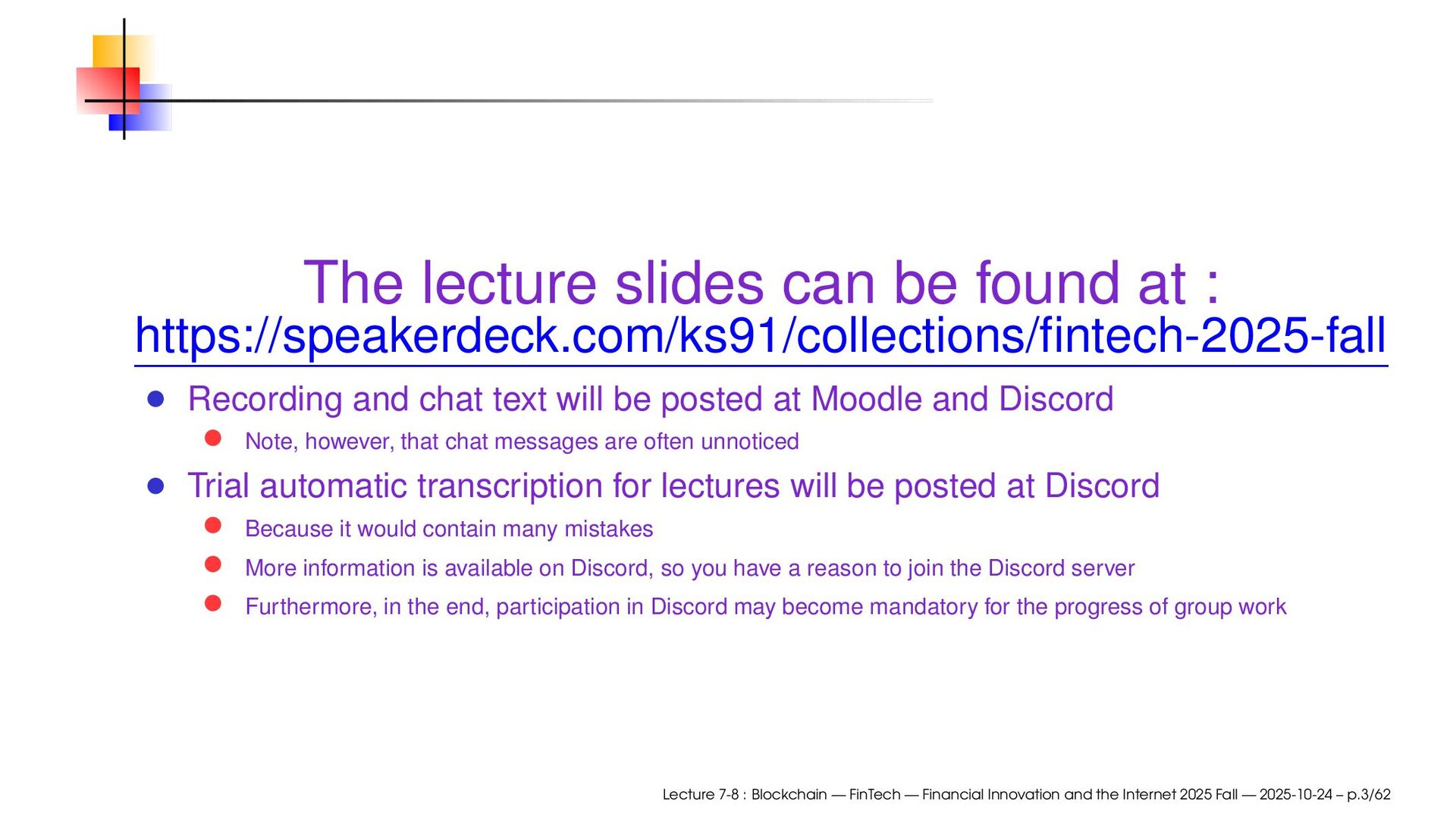 and chat text will be posted at Moodle and Discord Note, however, that chat messages are often unnoticed Trial automatic transcription for lectures will be posted at Discord Because it would contain many mistakes More information is available on Discord, so you have a reason to join the Discord server Furthermore, in the end, participation in Discord may become mandatory for the progress of group work Lecture 7-8 : Blockchain — FinTech — Financial Innovation and the Internet 2025 Fall — 2025-10-24 – p.3/62
