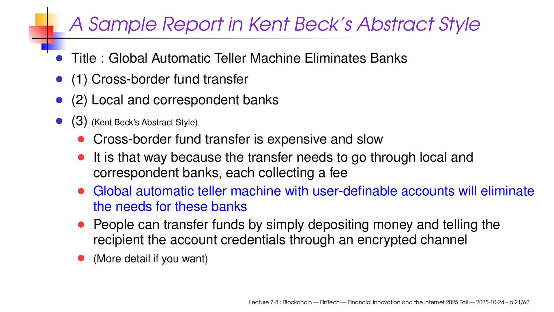 Global Automatic Teller Machine Eliminates Banks (1) Cross-border fund transfer (2) Local and correspondent banks (3) (Kent Beck’s Abstract Style) Cross-border fund transfer is expensive and slow It is that way because the transfer needs to go through local and correspondent banks, each collecting a fee Global automatic teller machine with user-definable accounts will eliminate the needs for these banks People can transfer funds by simply depositing money and telling the recipient the account credentials through an encrypted channel (More detail if you want) Lecture 7-8 : Blockchain — FinTech — Financial Innovation and the Internet 2025 Fall — 2025-10-24 – p.21/62
