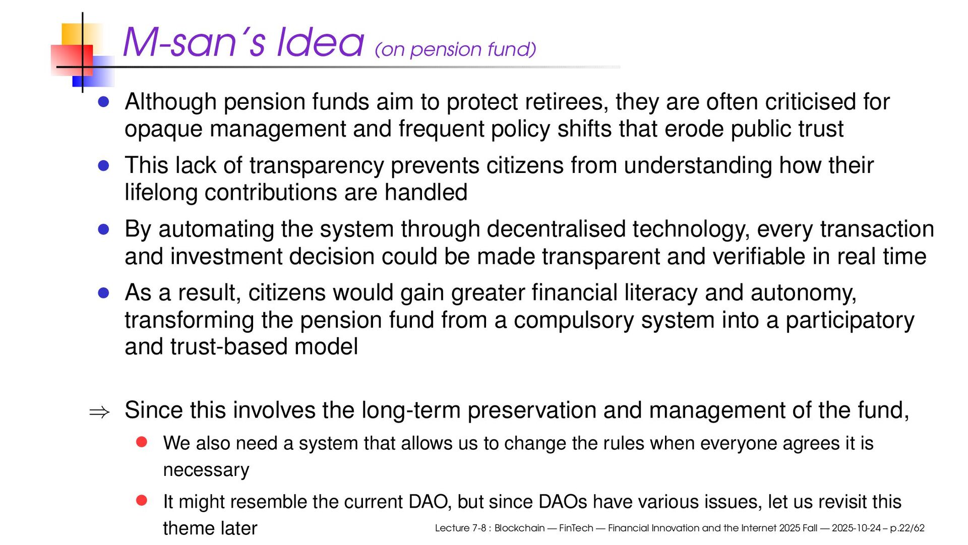 protect retirees, they are often criticised for opaque management and frequent policy shifts that erode public trust This lack of transparency prevents citizens from understanding how their lifelong contributions are handled By automating the system through decentralised technology, every transaction and investment decision could be made transparent and verifiable in real time As a result, citizens would gain greater financial literacy and autonomy, transforming the pension fund from a compulsory system into a participatory and trust-based model ⇒ Since this involves the long-term preservation and management of the fund, We also need a system that allows us to change the rules when everyone agrees it is necessary It might resemble the current DAO, but since DAOs have various issues, let us revisit this theme later Lecture 7-8 : Blockchain — FinTech — Financial Innovation and the Internet 2025 Fall — 2025-10-24 – p.22/62
