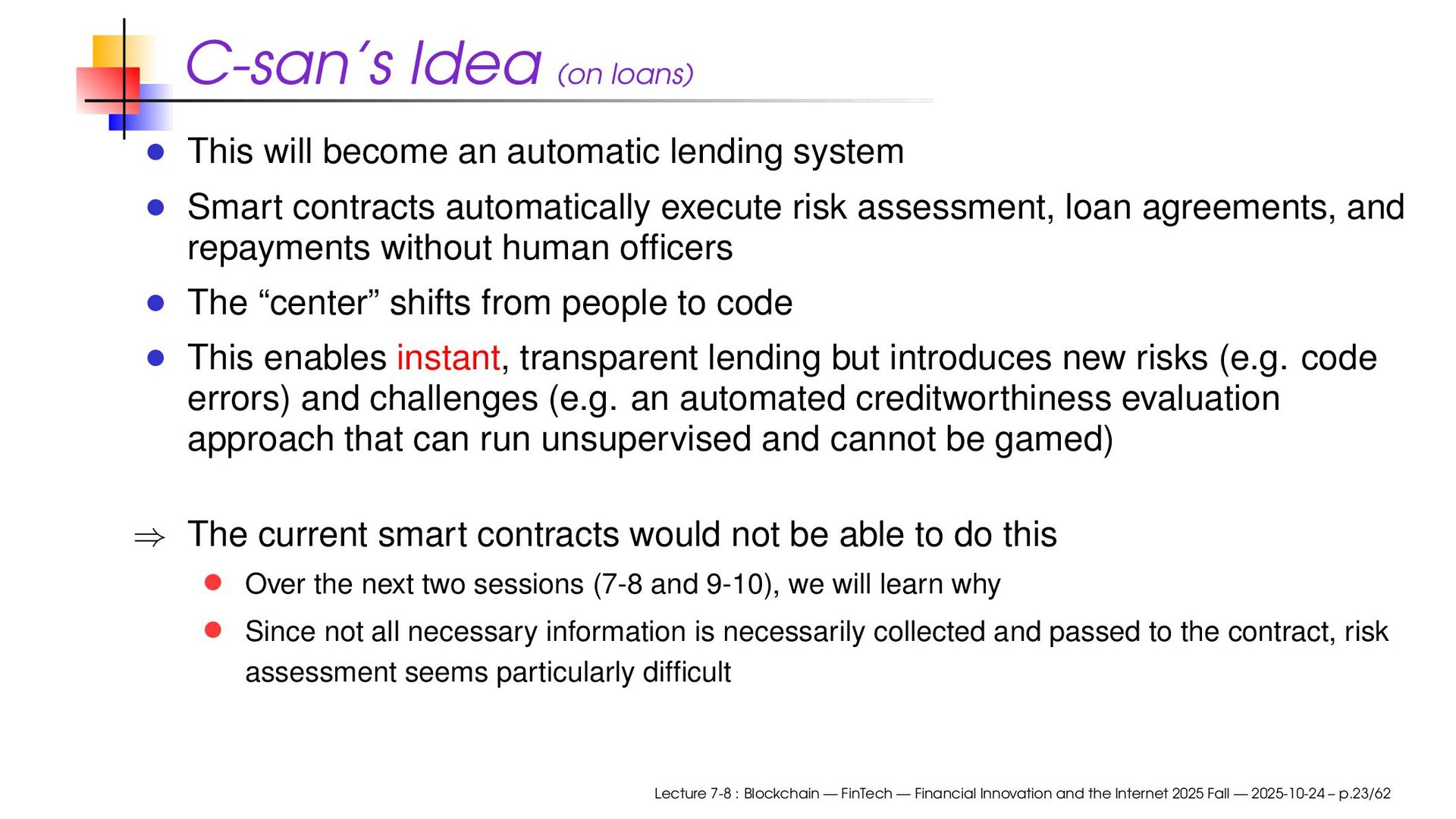 system Smart contracts automatically execute risk assessment, loan agreements, and repayments without human officers The “center” shifts from people to code This enables instant, transparent lending but introduces new risks (e.g. code errors) and challenges (e.g. an automated creditworthiness evaluation approach that can run unsupervised and cannot be gamed) ⇒ The current smart contracts would not be able to do this Over the next two sessions (7-8 and 9-10), we will learn why Since not all necessary information is necessarily collected and passed to the contract, risk assessment seems particularly difficult Lecture 7-8 : Blockchain — FinTech — Financial Innovation and the Internet 2025 Fall — 2025-10-24 – p.23/62