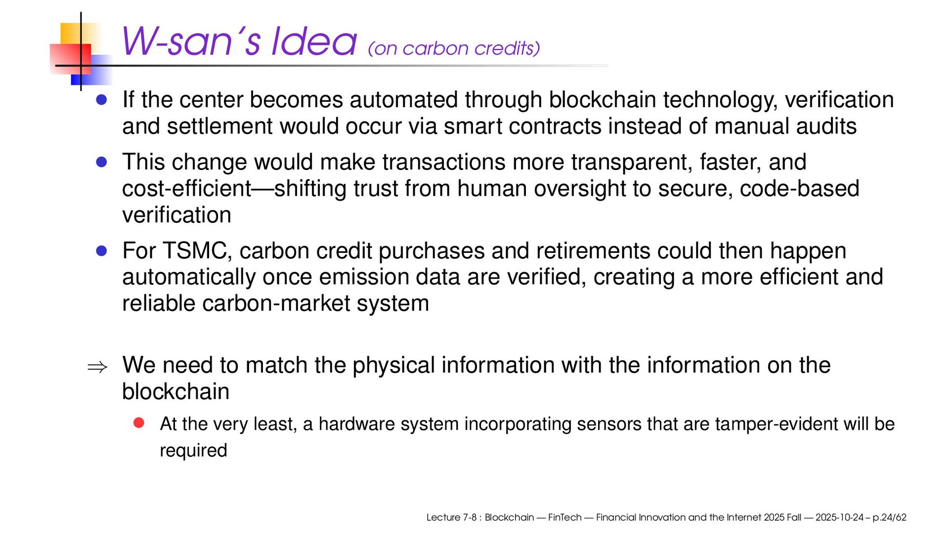 through blockchain technology, verification and settlement would occur via smart contracts instead of manual audits This change would make transactions more transparent, faster, and cost-efficient—shifting trust from human oversight to secure, code-based verification For TSMC, carbon credit purchases and retirements could then happen automatically once emission data are verified, creating a more efficient and reliable carbon-market system ⇒ We need to match the physical information with the information on the blockchain At the very least, a hardware system incorporating sensors that are tamper-evident will be required Lecture 7-8 : Blockchain — FinTech — Financial Innovation and the Internet 2025 Fall — 2025-10-24 – p.24/62