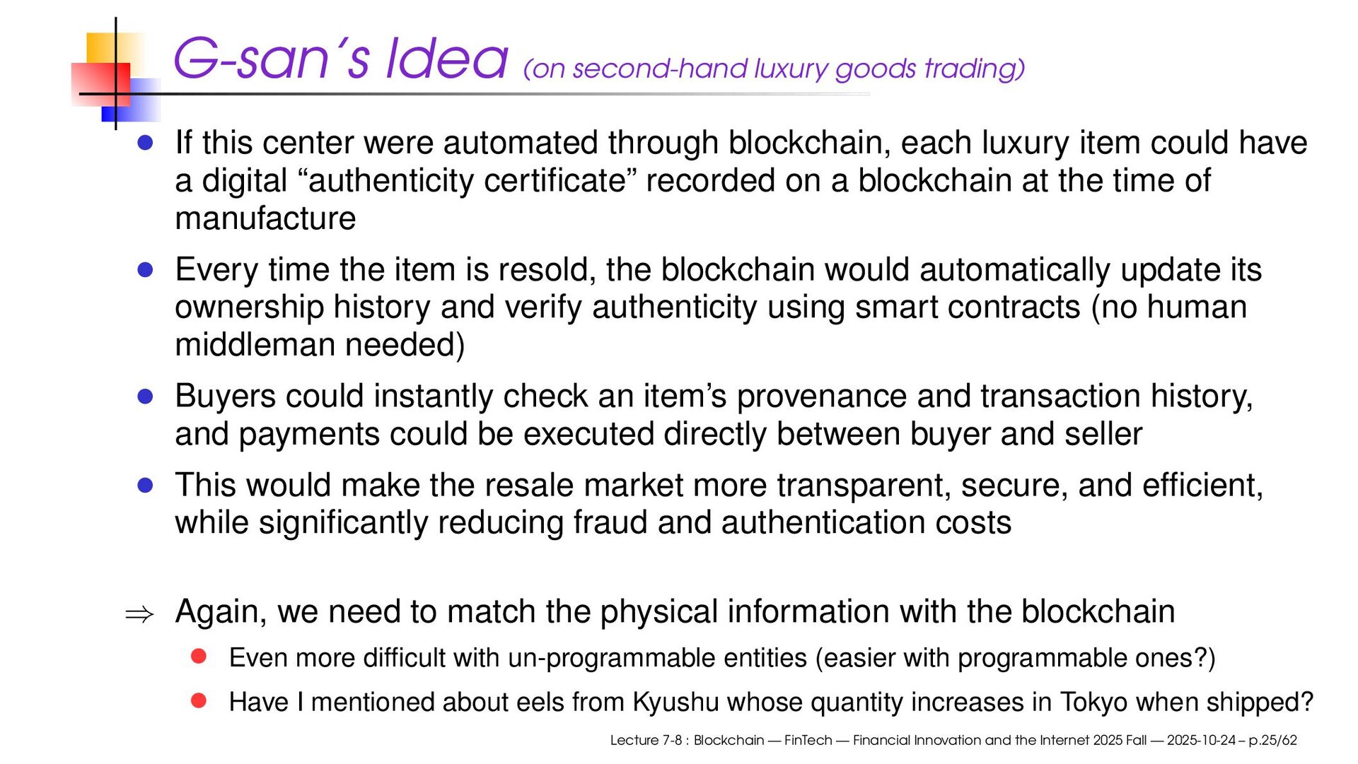 were automated through blockchain, each luxury item could have a digital “authenticity certificate” recorded on a blockchain at the time of manufacture Every time the item is resold, the blockchain would automatically update its ownership history and verify authenticity using smart contracts (no human middleman needed) Buyers could instantly check an item’s provenance and transaction history, and payments could be executed directly between buyer and seller This would make the resale market more transparent, secure, and efficient, while significantly reducing fraud and authentication costs ⇒ Again, we need to match the physical information with the blockchain Even more difficult with un-programmable entities (easier with programmable ones?) Have I mentioned about eels from Kyushu whose quantity increases in Tokyo when shipped? Lecture 7-8 : Blockchain — FinTech — Financial Innovation and the Internet 2025 Fall — 2025-10-24 – p.25/62