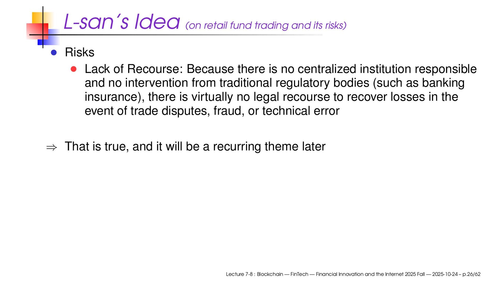 Lack of Recourse: Because there is no centralized institution responsible and no intervention from traditional regulatory bodies (such as banking insurance), there is virtually no legal recourse to recover losses in the event of trade disputes, fraud, or technical error ⇒ That is true, and it will be a recurring theme later Lecture 7-8 : Blockchain — FinTech — Financial Innovation and the Internet 2025 Fall — 2025-10-24 – p.26/62
