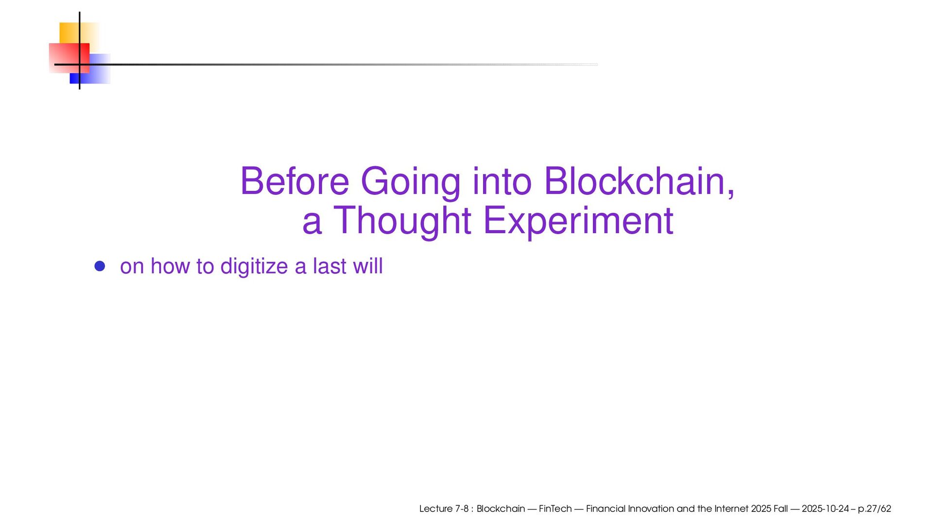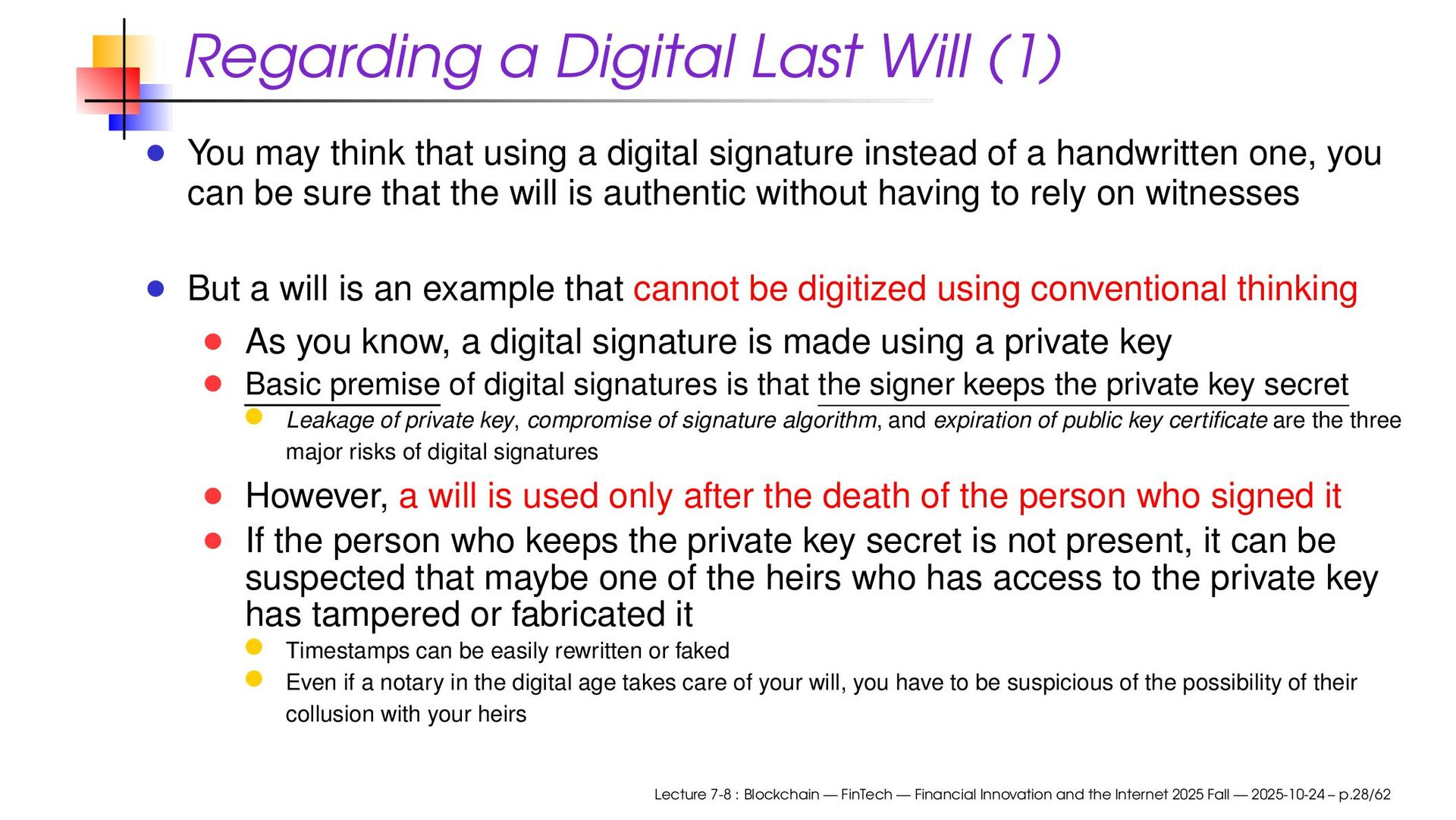 using a digital signature instead of a handwritten one, you can be sure that the will is authentic without having to rely on witnesses But a will is an example that cannot be digitized using conventional thinking As you know, a digital signature is made using a private key Basic premise of digital signatures is that the signer keeps the private key secret Leakage of private key, compromise of signature algorithm, and expiration of public key certificate are the three major risks of digital signatures However, a will is used only after the death of the person who signed it If the person who keeps the private key secret is not present, it can be suspected that maybe one of the heirs who has access to the private key has tampered or fabricated it Timestamps can be easily rewritten or faked Even if a notary in the digital age takes care of your will, you have to be suspicious of the possibility of their collusion with your heirs Lecture 7-8 : Blockchain — FinTech — Financial Innovation and the Internet 2025 Fall — 2025-10-24 – p.28/62