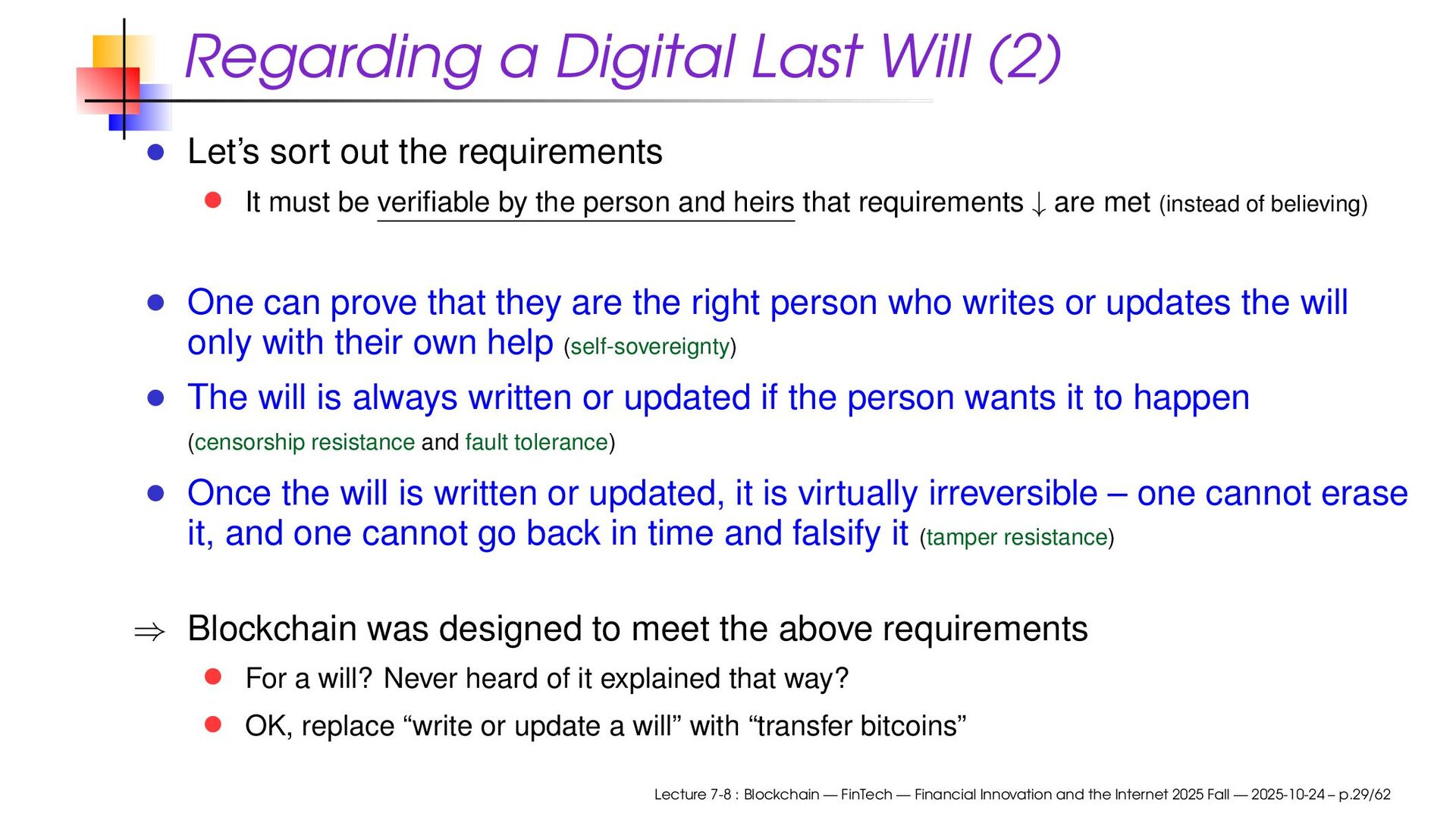 requirements It must be verifiable by the person and heirs that requirements ↓ are met (instead of believing) One can prove that they are the right person who writes or updates the will only with their own help (self-sovereignty) The will is always written or updated if the person wants it to happen (censorship resistance and fault tolerance) Once the will is written or updated, it is virtually irreversible – one cannot erase it, and one cannot go back in time and falsify it (tamper resistance) ⇒ Blockchain was designed to meet the above requirements For a will? Never heard of it explained that way? OK, replace “write or update a will” with “transfer bitcoins” Lecture 7-8 : Blockchain — FinTech — Financial Innovation and the Internet 2025 Fall — 2025-10-24 – p.29/62