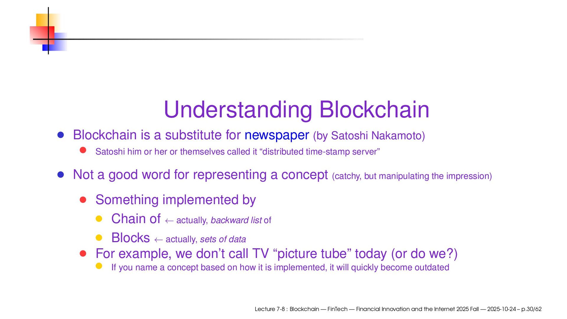 Nakamoto) Satoshi him or her or themselves called it “distributed time-stamp server” Not a good word for representing a concept (catchy, but manipulating the impression) Something implemented by Chain of ← actually, backward list of Blocks ← actually, sets of data For example, we don’t call TV “picture tube” today (or do we?) If you name a concept based on how it is implemented, it will quickly become outdated Lecture 7-8 : Blockchain — FinTech — Financial Innovation and the Internet 2025 Fall — 2025-10-24 – p.30/62