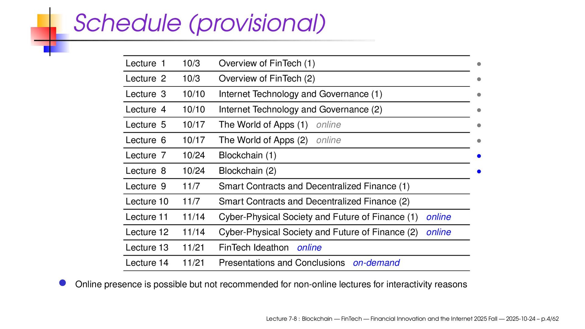 Lecture 2 10/3 Overview of FinTech (2) • Lecture 3 10/10 Internet Technology and Governance (1) • Lecture 4 10/10 Internet Technology and Governance (2) • Lecture 5 10/17 The World of Apps (1) online • Lecture 6 10/17 The World of Apps (2) online • Lecture 7 10/24 Blockchain (1) • Lecture 8 10/24 Blockchain (2) • Lecture 9 11/7 Smart Contracts and Decentralized Finance (1) Lecture 10 11/7 Smart Contracts and Decentralized Finance (2) Lecture 11 11/14 Cyber-Physical Society and Future of Finance (1) online Lecture 12 11/14 Cyber-Physical Society and Future of Finance (2) online Lecture 13 11/21 FinTech Ideathon online Lecture 14 11/21 Presentations and Conclusions on-demand Online presence is possible but not recommended for non-online lectures for interactivity reasons Lecture 7-8 : Blockchain — FinTech — Financial Innovation and the Internet 2025 Fall — 2025-10-24 – p.4/62