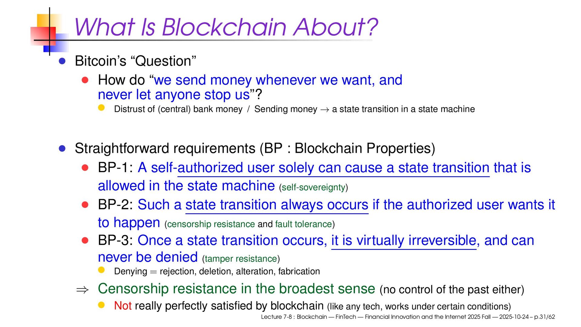 money whenever we want, and never let anyone stop us”? Distrust of (central) bank money / Sending money → a state transition in a state machine Straightforward requirements (BP : Blockchain Properties) BP-1: A self-authorized user solely can cause a state transition that is allowed in the state machine (self-sovereignty) BP-2: Such a state transition always occurs if the authorized user wants it to happen (censorship resistance and fault tolerance) BP-3: Once a state transition occurs, it is virtually irreversible, and can never be denied (tamper resistance) Denying = rejection, deletion, alteration, fabrication ⇒ Censorship resistance in the broadest sense (no control of the past either) Not really perfectly satisfied by blockchain (like any tech, works under certain conditions) Lecture 7-8 : Blockchain — FinTech — Financial Innovation and the Internet 2025 Fall — 2025-10-24 – p.31/62