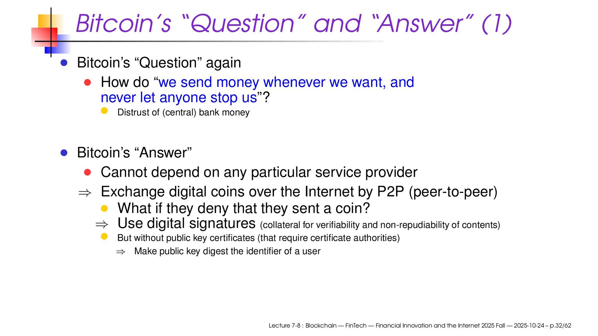 “we send money whenever we want, and never let anyone stop us”? Distrust of (central) bank money Bitcoin’s “Answer” Cannot depend on any particular service provider ⇒ Exchange digital coins over the Internet by P2P (peer-to-peer) What if they deny that they sent a coin? ⇒ Use digital signatures (collateral for verifiability and non-repudiability of contents) But without public key certificates (that require certificate authorities) ⇒ Make public key digest the identifier of a user Lecture 7-8 : Blockchain — FinTech — Financial Innovation and the Internet 2025 Fall — 2025-10-24 – p.32/62