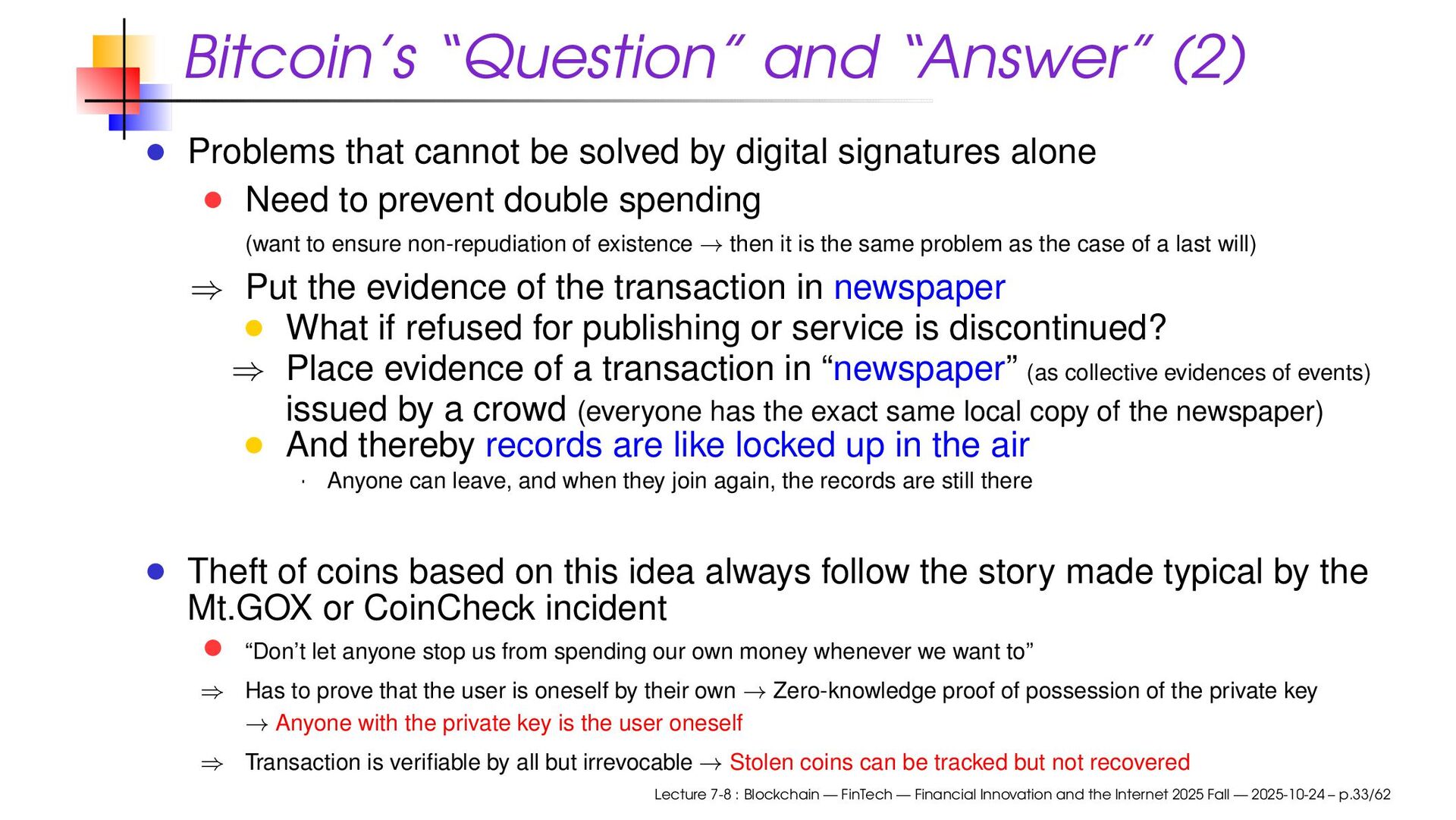 by digital signatures alone Need to prevent double spending (want to ensure non-repudiation of existence → then it is the same problem as the case of a last will) ⇒ Put the evidence of the transaction in newspaper What if refused for publishing or service is discontinued? ⇒ Place evidence of a transaction in “newspaper” (as collective evidences of events) issued by a crowd (everyone has the exact same local copy of the newspaper) And thereby records are like locked up in the air · Anyone can leave, and when they join again, the records are still there Theft of coins based on this idea always follow the story made typical by the Mt.GOX or CoinCheck incident “Don’t let anyone stop us from spending our own money whenever we want to” ⇒ Has to prove that the user is oneself by their own → Zero-knowledge proof of possession of the private key → Anyone with the private key is the user oneself ⇒ Transaction is verifiable by all but irrevocable → Stolen coins can be tracked but not recovered Lecture 7-8 : Blockchain — FinTech — Financial Innovation and the Internet 2025 Fall — 2025-10-24 – p.33/62