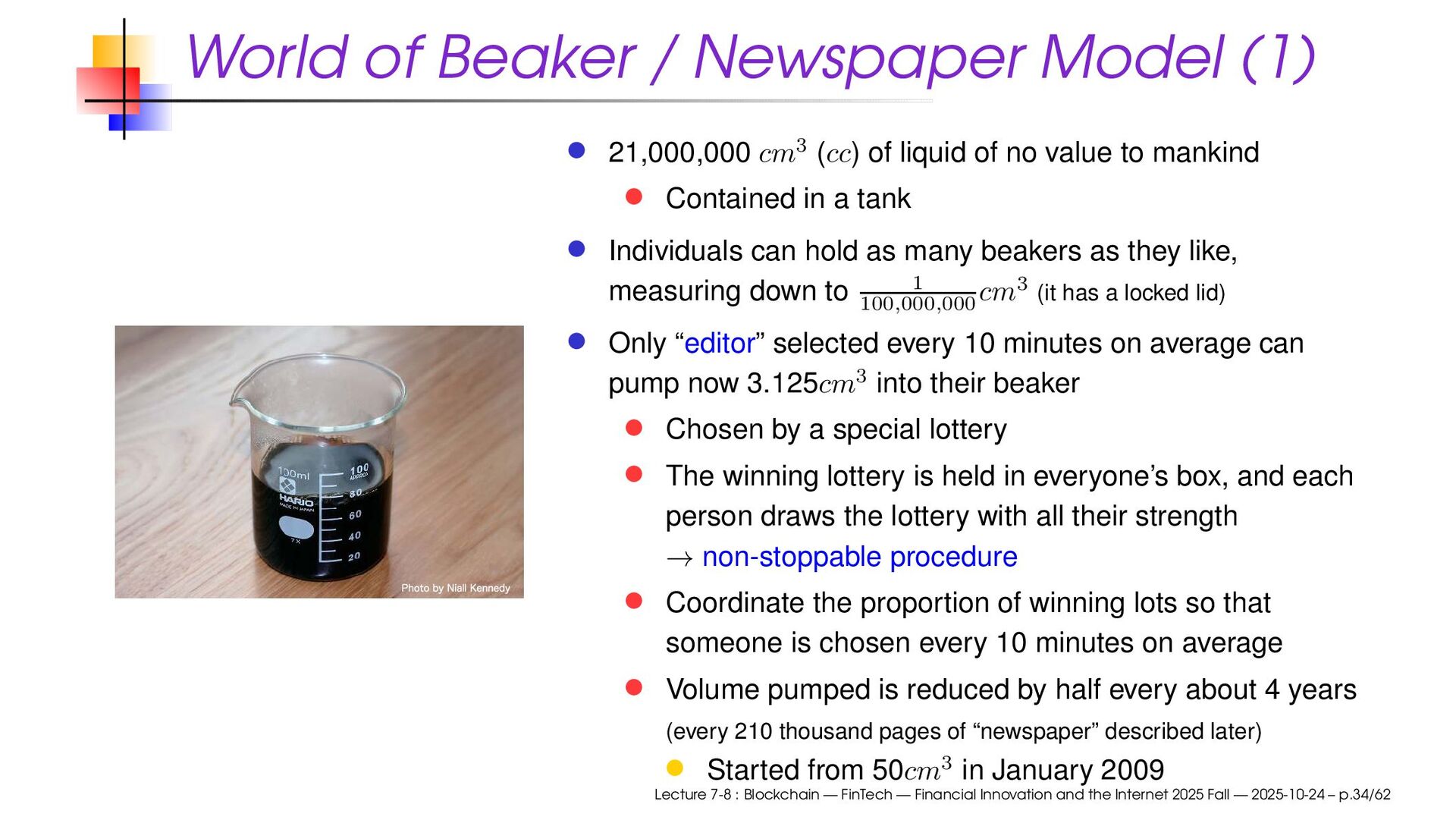 of liquid of no value to mankind Contained in a tank Individuals can hold as many beakers as they like, measuring down to 1 100 , 000 , 000 cm3 (it has a locked lid) Only “editor” selected every 10 minutes on average can pump now 3.125cm3 into their beaker Chosen by a special lottery The winning lottery is held in everyone’s box, and each person draws the lottery with all their strength → non-stoppable procedure Coordinate the proportion of winning lots so that someone is chosen every 10 minutes on average Volume pumped is reduced by half every about 4 years (every 210 thousand pages of “newspaper” described later) Started from 50cm3 in January 2009 Lecture 7-8 : Blockchain — FinTech — Financial Innovation and the Internet 2025 Fall — 2025-10-24 – p.34/62