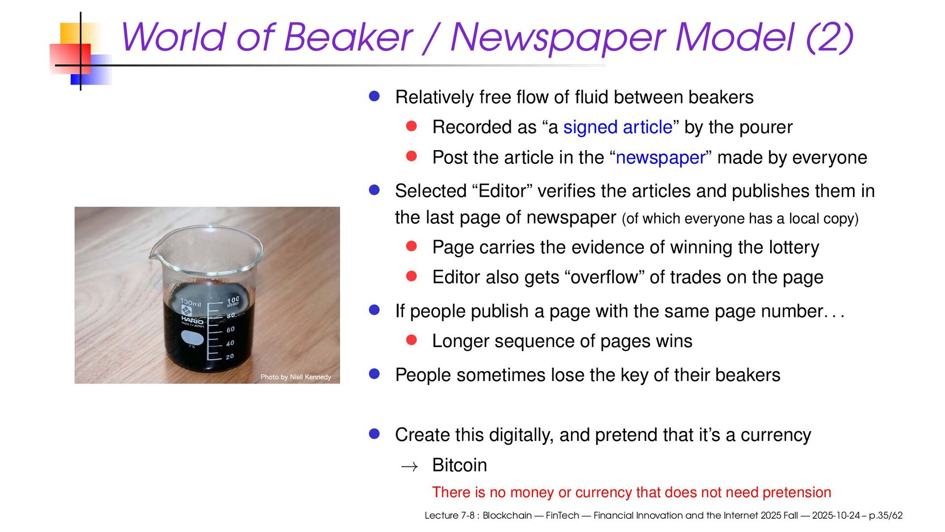 of fluid between beakers Recorded as “a signed article” by the pourer Post the article in the “newspaper” made by everyone Selected “Editor” verifies the articles and publishes them in the last page of newspaper (of which everyone has a local copy) Page carries the evidence of winning the lottery Editor also gets “overflow” of trades on the page If people publish a page with the same page number. . . Longer sequence of pages wins People sometimes lose the key of their beakers Create this digitally, and pretend that it’s a currency → Bitcoin There is no money or currency that does not need pretension Lecture 7-8 : Blockchain — FinTech — Financial Innovation and the Internet 2025 Fall — 2025-10-24 – p.35/62
