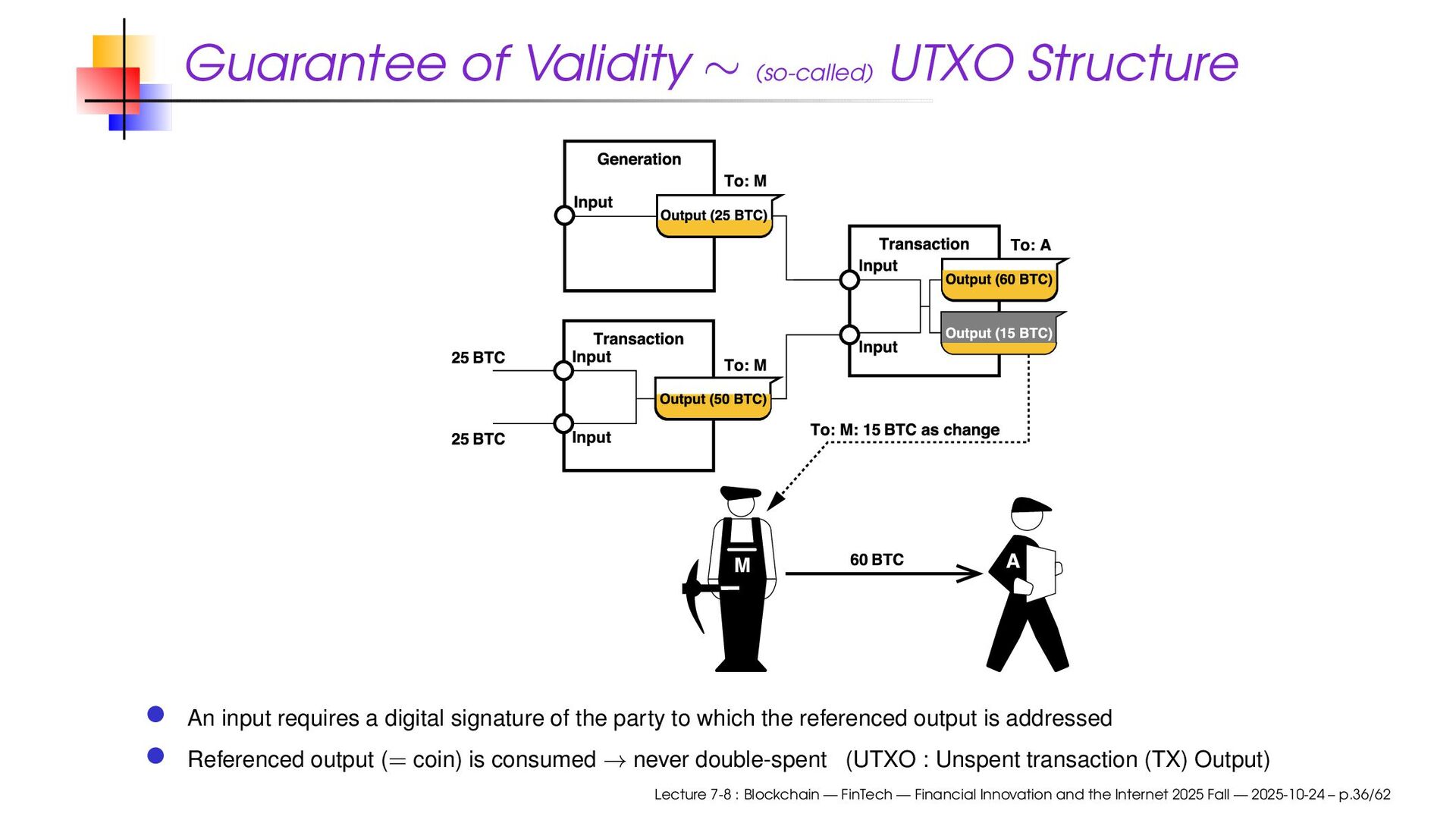 a digital signature of the party to which the referenced output is addressed Referenced output (= coin) is consumed → never double-spent (UTXO : Unspent transaction (TX) Output) Lecture 7-8 : Blockchain — FinTech — Financial Innovation and the Internet 2025 Fall — 2025-10-24 – p.36/62