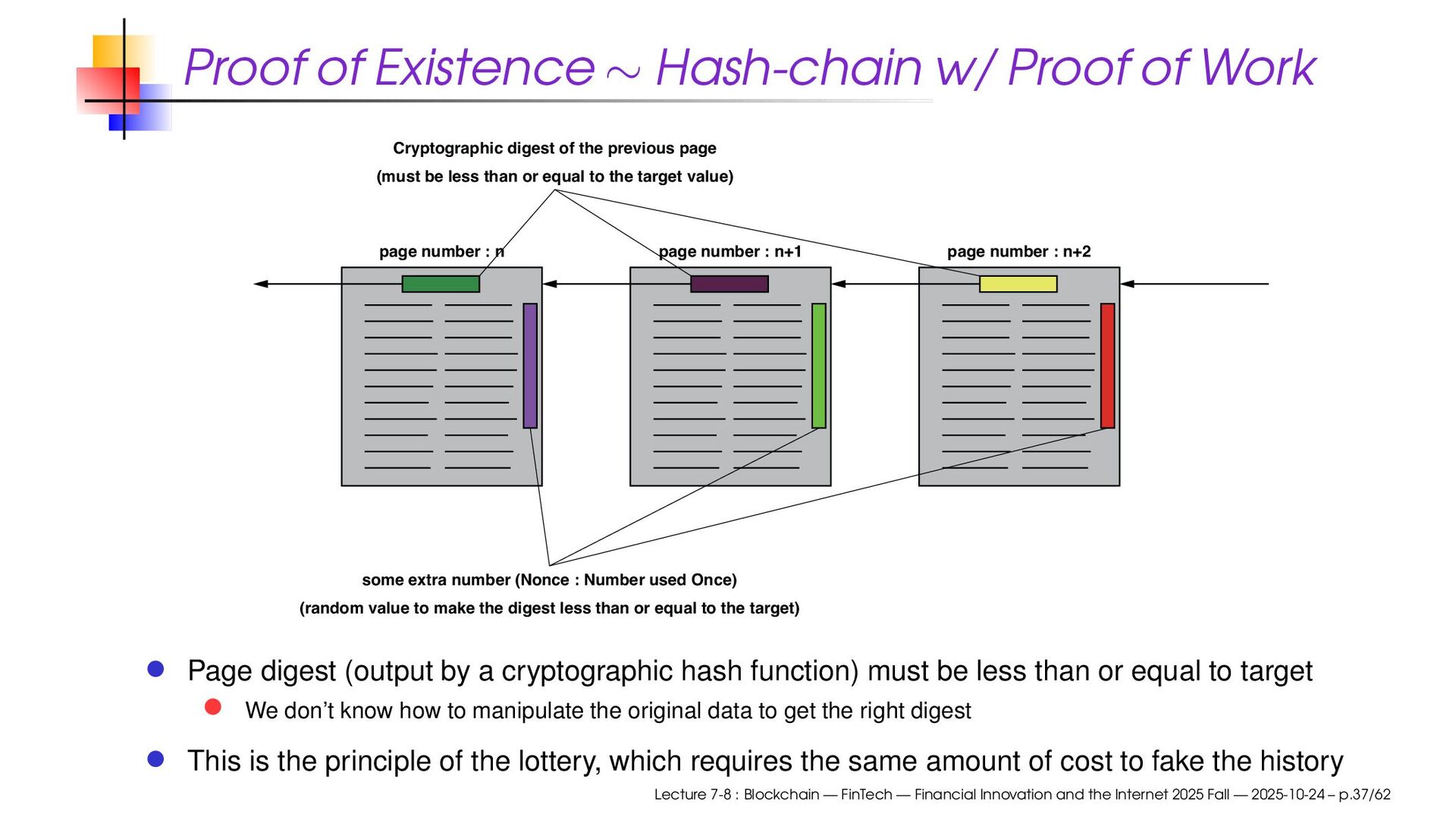 number : n page number : n+1 page number : n+2 Cryptographic digest of the previous page (must be less than or equal to the target value) some extra number (Nonce : Number used Once) (random value to make the digest less than or equal to the target) Page digest (output by a cryptographic hash function) must be less than or equal to target We don’t know how to manipulate the original data to get the right digest This is the principle of the lottery, which requires the same amount of cost to fake the history Lecture 7-8 : Blockchain — FinTech — Financial Innovation and the Internet 2025 Fall — 2025-10-24 – p.37/62