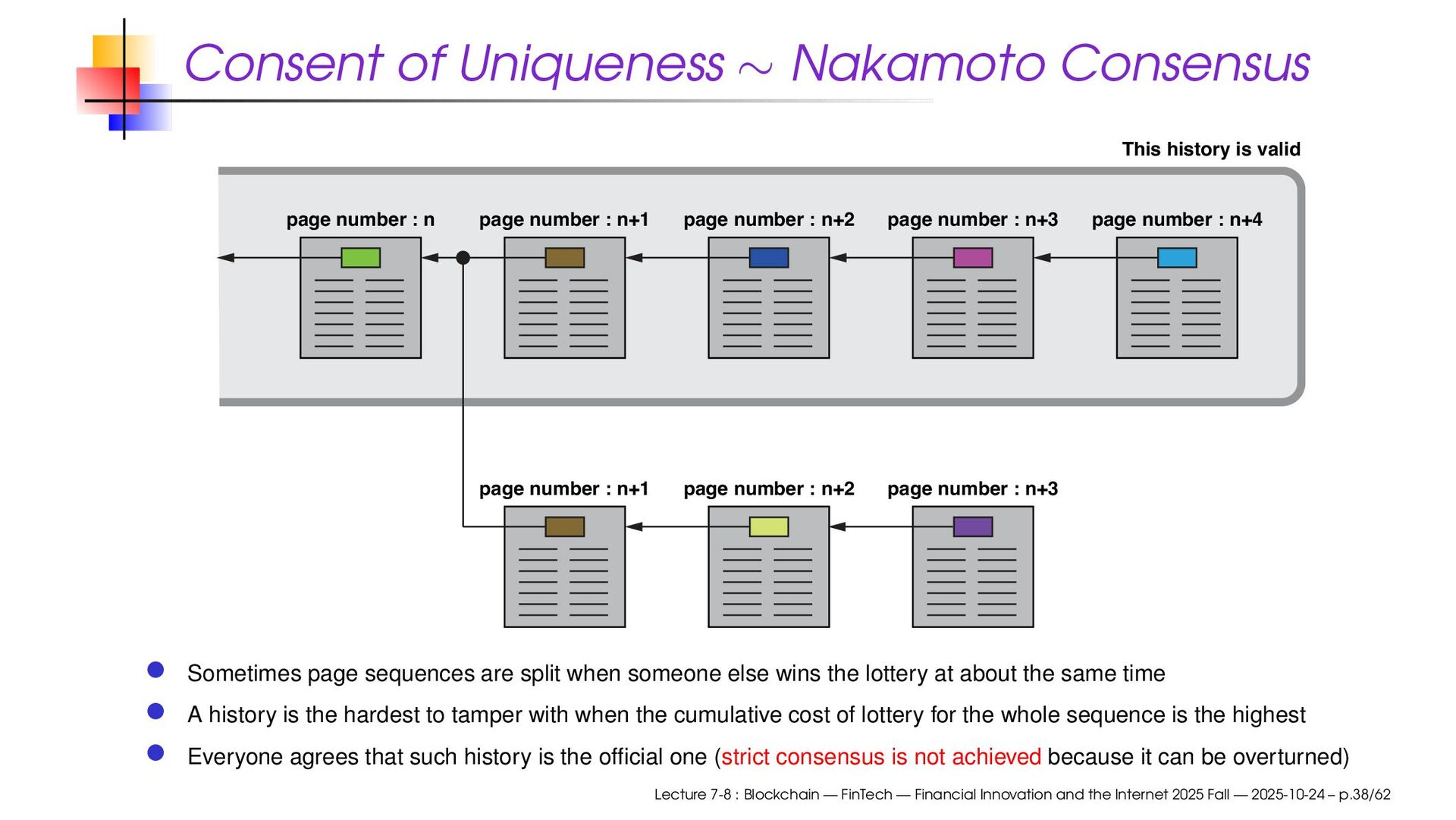 page number : n+1 page number : n+2 page number : n+3 page number : n+1 page number : n+2 page number : n+3 page number : n+4 This history is valid Sometimes page sequences are split when someone else wins the lottery at about the same time A history is the hardest to tamper with when the cumulative cost of lottery for the whole sequence is the highest Everyone agrees that such history is the official one (strict consensus is not achieved because it can be overturned) Lecture 7-8 : Blockchain — FinTech — Financial Innovation and the Internet 2025 Fall — 2025-10-24 – p.38/62